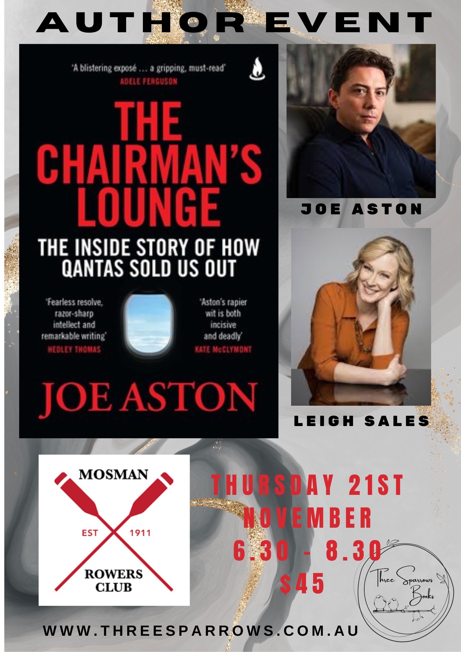 Join us at Mosman Rowers for a full in-flight service on Thursday 21st November to hear Leigh Sales talk to Joe Aston, must-read journalist on how power, money and influence work in this country, and specifically the full story of how one of the nation’s favourite brands brought itself to ground.Both Joe and Leigh will be signing books after the event.