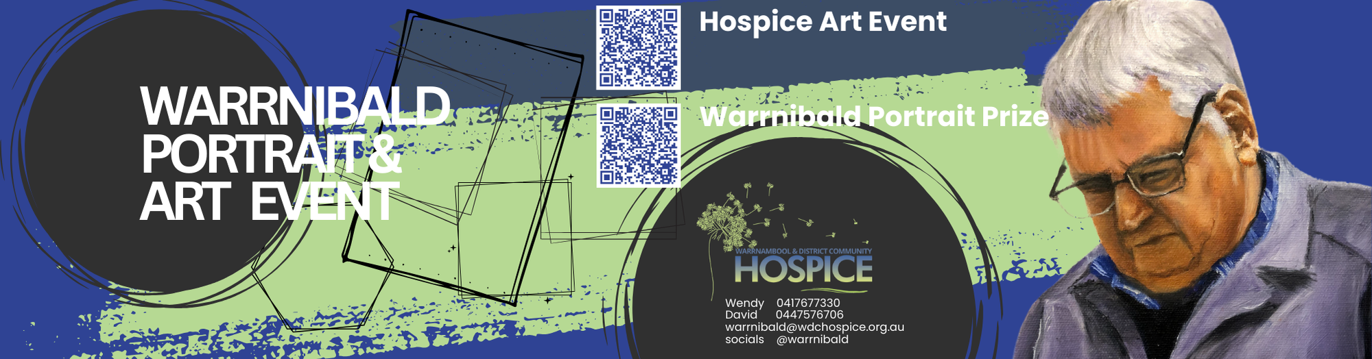 QR Code to enter art is located in header.The Warrnibald Portrait & Art Event is hosted by Warrnambool & District Community Hospice and is a celebration of art, artists and volunteers. It features both the much-loved Warrnibald Portrait Prize and general art in the Hospice Art Event. Also incorporated are workshops, demonstrations and more.