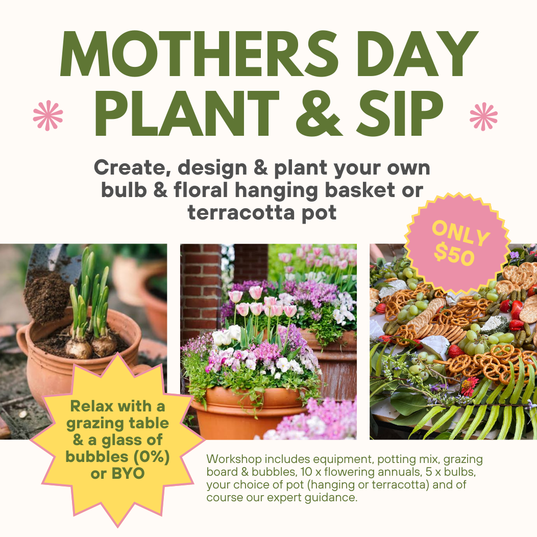 Book Mum or the whole family in for our Plant and Sip session!Bonville Nursery owner, Chloe will teach you how to create, design & plant your own bulb & floral hanging basket or terracotta pot suited to our climate and region.