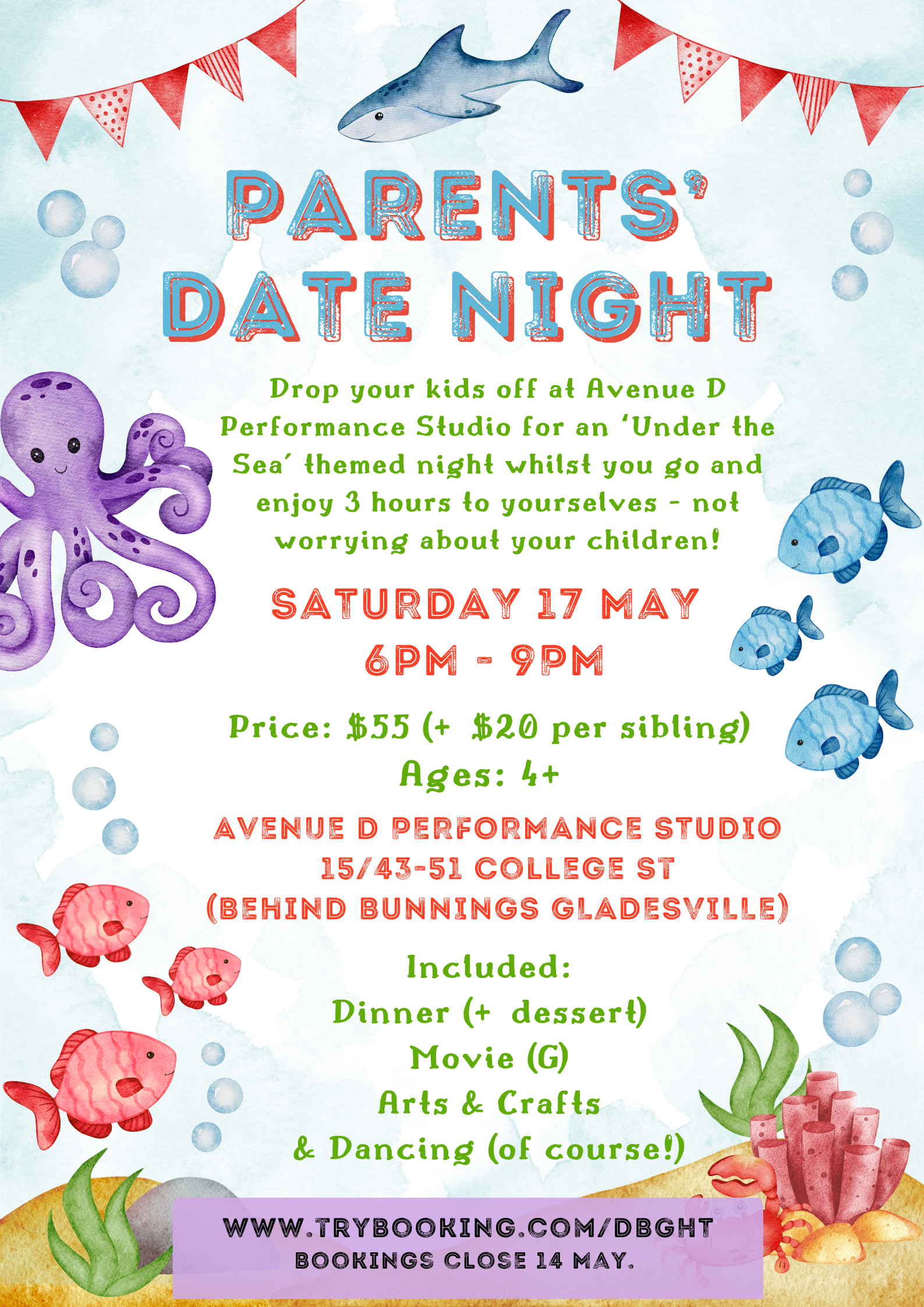Drop your kids off at Avenue D Performance Studio for an ‘Under the Sea’ themed night whilst you go and enjoy 3 hours to yourselves - not worrying about your children!Saturday 17 May - 6pm - 9pm @ Avenue D Performance Studio