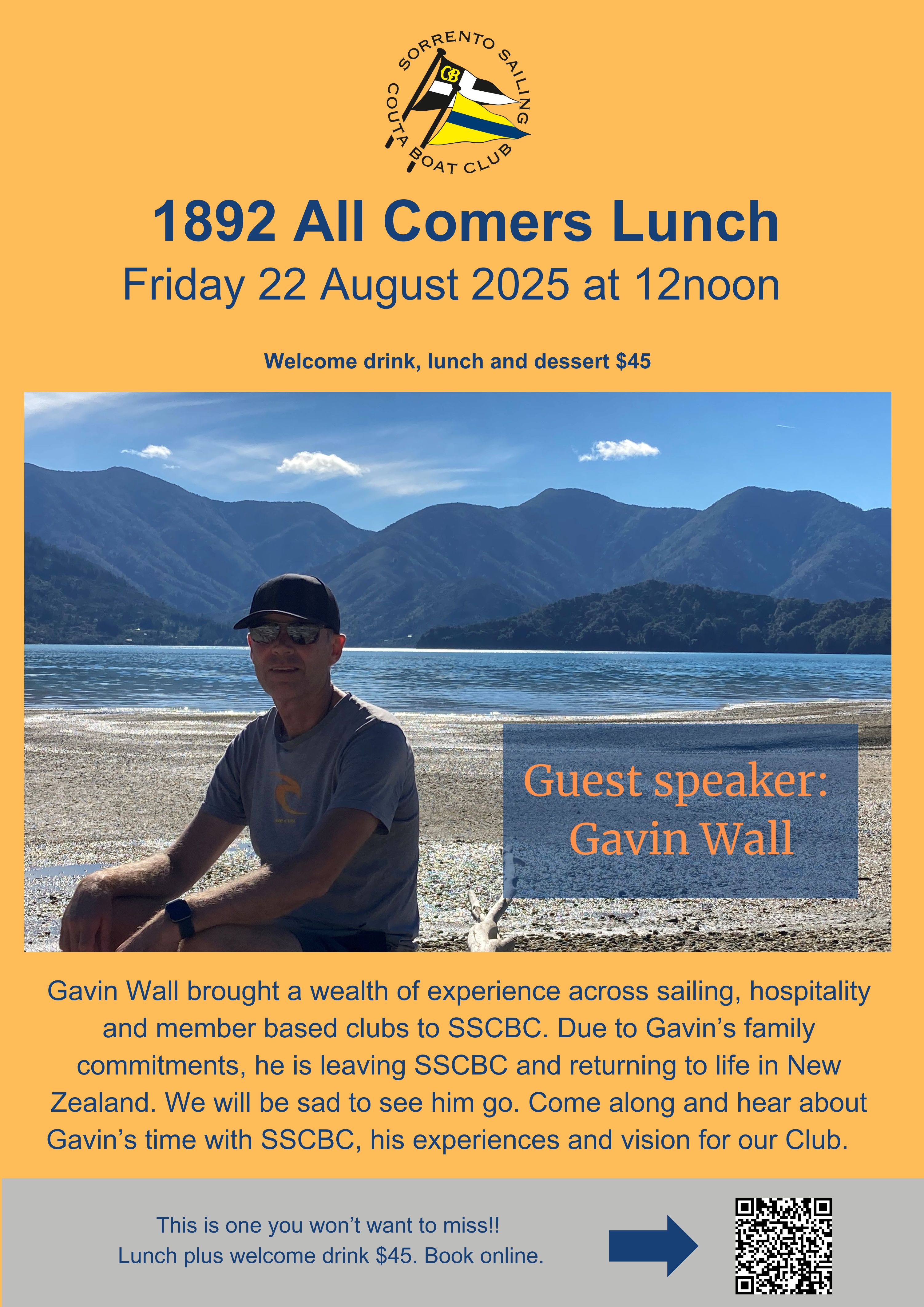 Gavin Wall brought a wealth of experience across sailing, hospitality and member based clubs to SSCBC. Due to Gavin’s family commitments, he is leaving SSCBC and returning to life in New Zealand. We will be sad to see him go. Come along and hear about Gavin’s time with SSCBC, his experiences and vision for our Club.