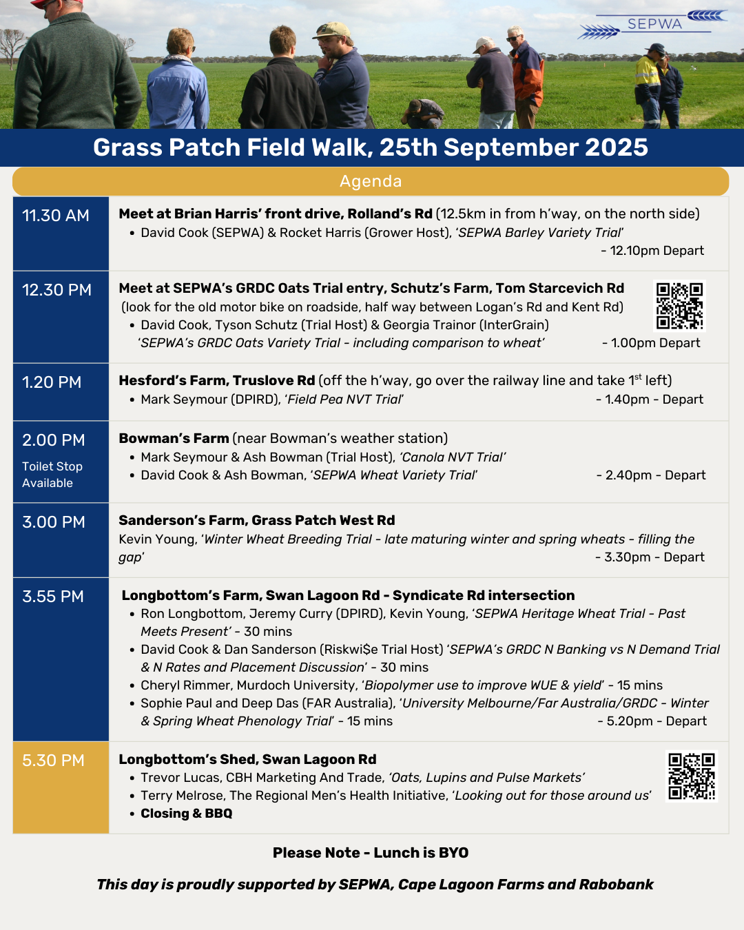 See the flyer below for all the details on SEPWA's Grass Patch Field Day on Thursday 25 September.Location