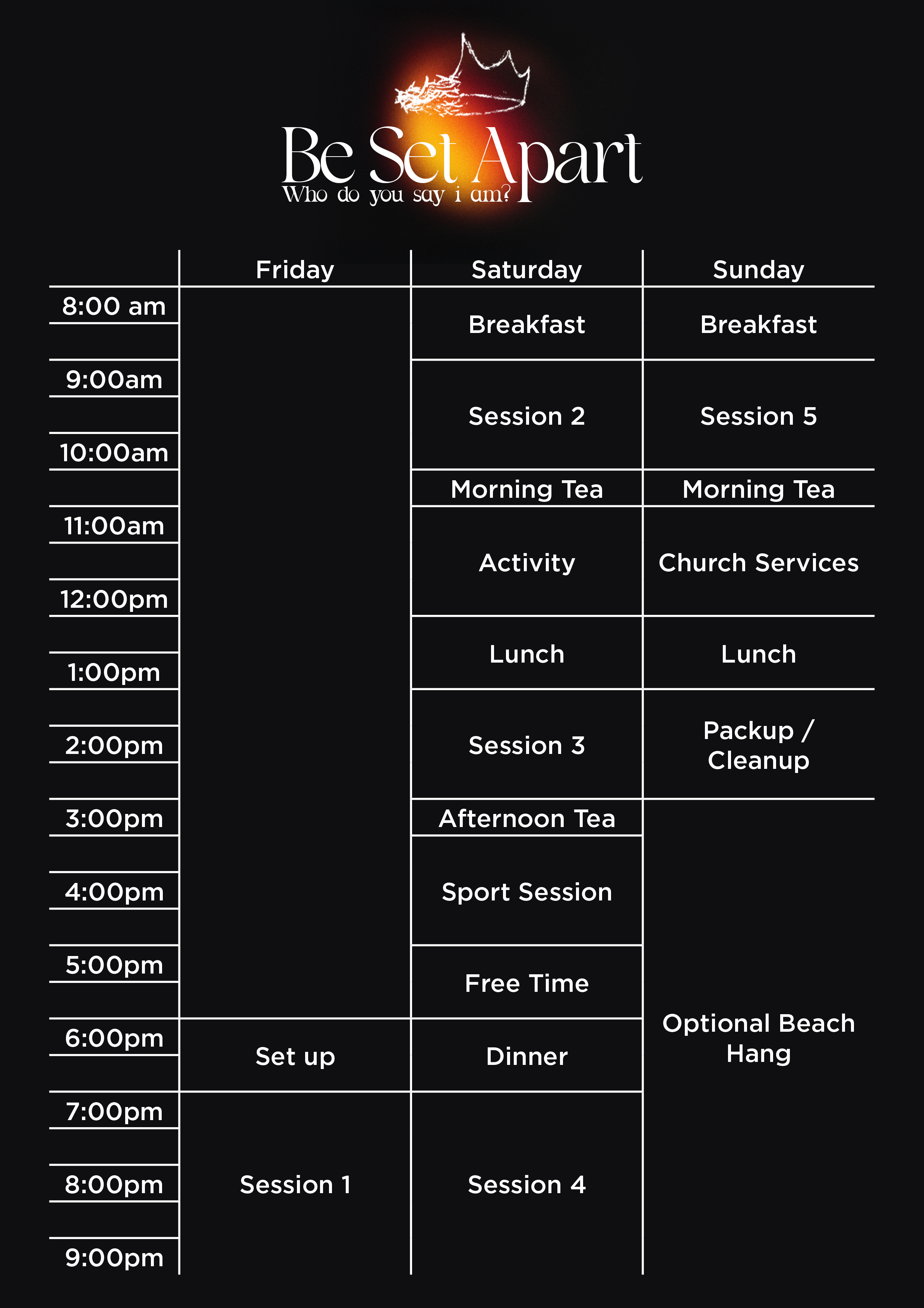 Be Set Apart is a powerful weekend retreat designed for young adults seeking to draw closer to God and discover their true identity in Him. With the theme “Who You Say I Am” (Matthew 16:13–20), we will journey into what it means to know who Jesus is and who we are as His followers.