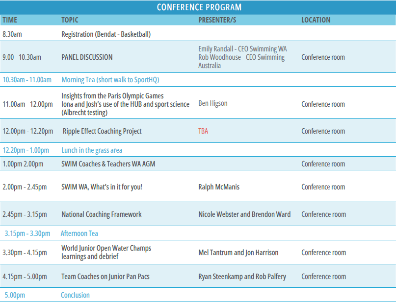 The program for the day will be available soon and will commence at 8:30am with Swimming WA CEO, Emily Randall and Swimming Australia CEO, Rob Woodhouse. SWIM Coaches & Teachers CEO, Brendon Ward will also be in attendance.