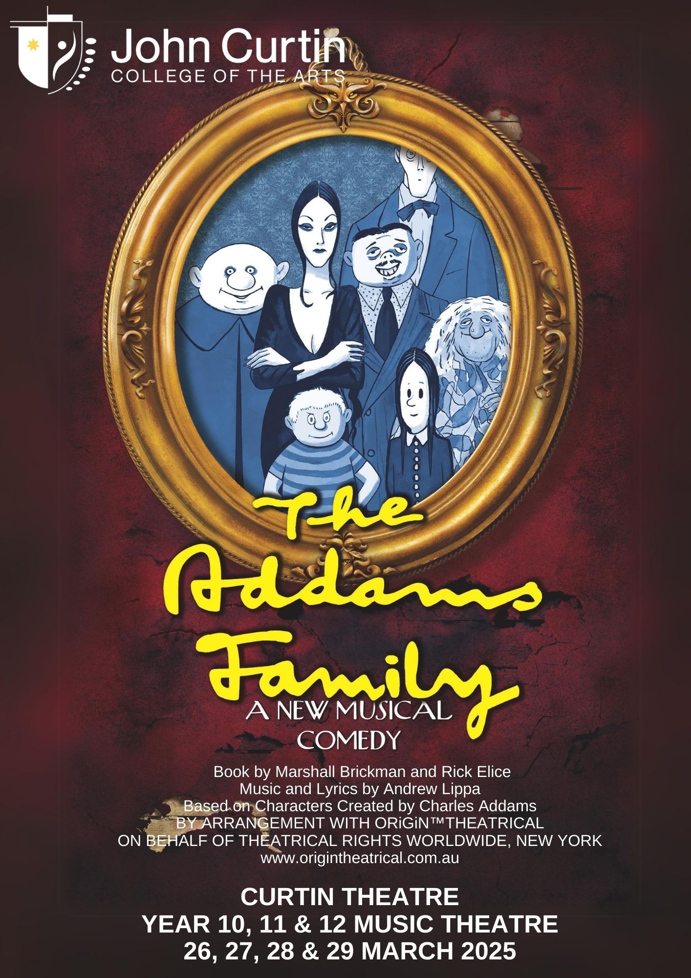 THE ADDAMS FAMILY - A New Musical (SOLD OUT)Book by Marshall Brickman and Rick EliceMusic and Lyrics by Andrew Lippa Based on Characters Created by Charles Addams BY ARRANGEMENT WITH ORIGIN THEATRICAL ON BEHALF OF THEATRICAL RIGHTS WORLDWIDE, NEW YORK www.origintheatrical.com.au They're creepy and they're kooky, they’re The Addams Family! Join us on an unforgettable journey as the iconic, eccentric family is brought to life with dark humour, catchy songs, and unexpected twists. Watch as Gomez, Morticia, Wednesday, and the rest of the hilarious family navigate love, drama and spooky adventures. With vibrant performances, a stunning set, and unforgettable music, this show is sure to delight audiences of all ages. VENUE: