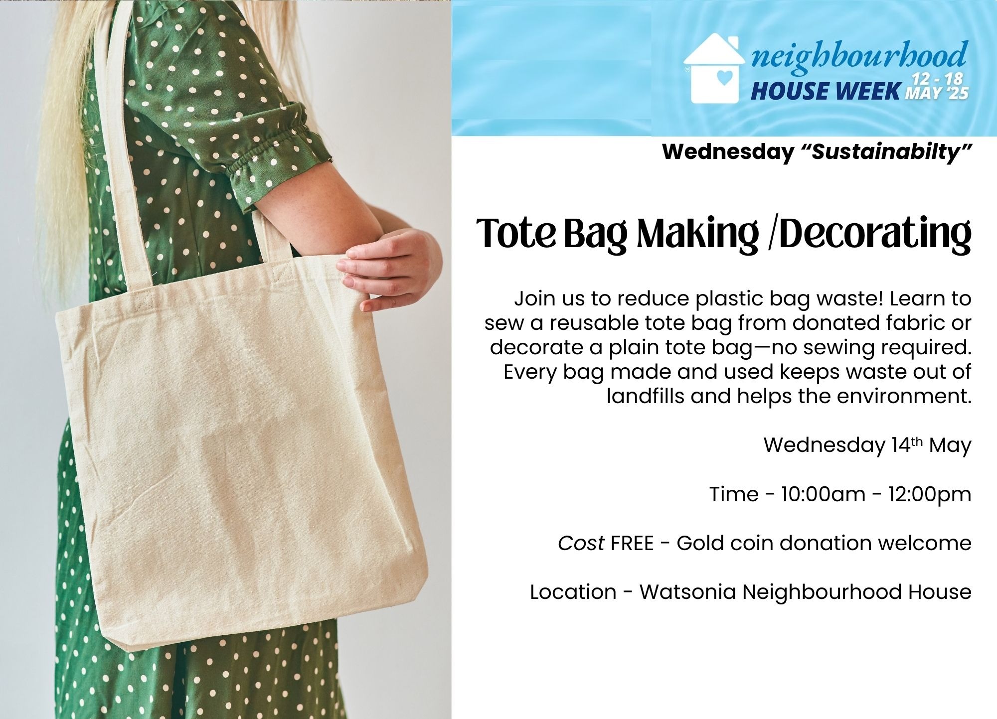 Help us reduce plastic bag waste and learn to sew a tote bag made from donated fabric. Every bag made and used reduces what ends up in landfill and helps the environmentWe are celebrating Neighbourhood House Week from 12 to 18 May 2025. We’re making waves with the theme "Ripples of Change"! Every action, no matter how small, has the power to create a ripple effect — spreading kindness, sparking ideas, and strengthening communities.