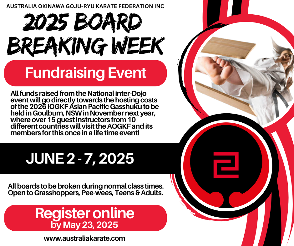 The 2025 AOGKF Board Breaking Fundraiser is a National inter-dojo event that will be taking place from June 2-7, 2025. It is open to all AOGKF members including Grasshoppers, Pee-wees, Teens and Adults. All profits from the event will go directly towards the hosting costs of the 2026 IOGKF Asian Pacific Gasshuku that will be hosted by the AOGKF in November 2026.Location