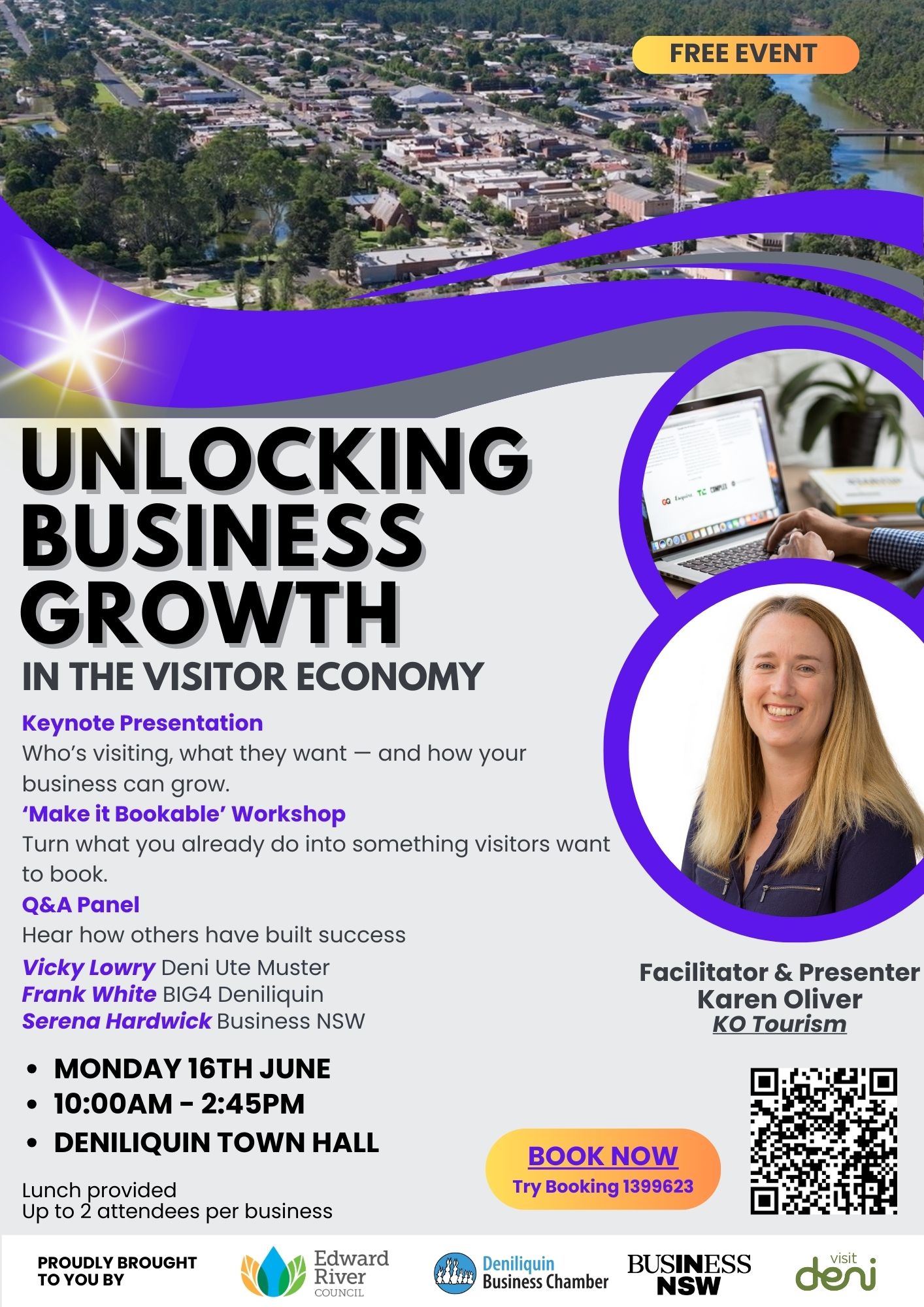 - Interactive workshop: Make It Bookable: Turn your business into an experience visitors want to buy - This session will help you identify opportunities within your business to create bookable, engaging experiences and explore partnerships that enhance the experience for visitors to the Edward River region.