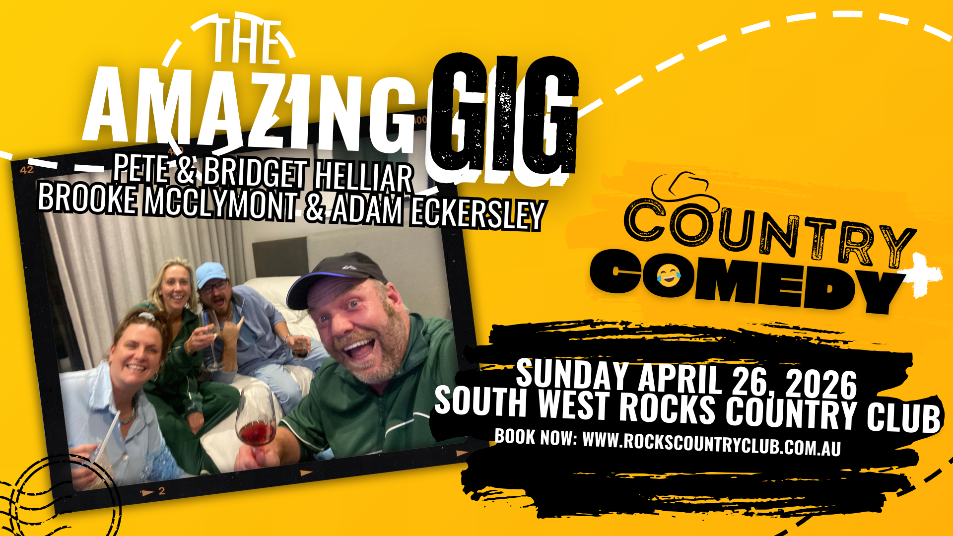 Comedian Pete Helliar, his wife Bridget, and country stars Brooke McClymont & Adam Eckersley – all stars of the 2024 Amazing Race: Celebrity Edition – are joining forces for a fun-filled blend of big laughs, country tunes, and darn-right entertainment.