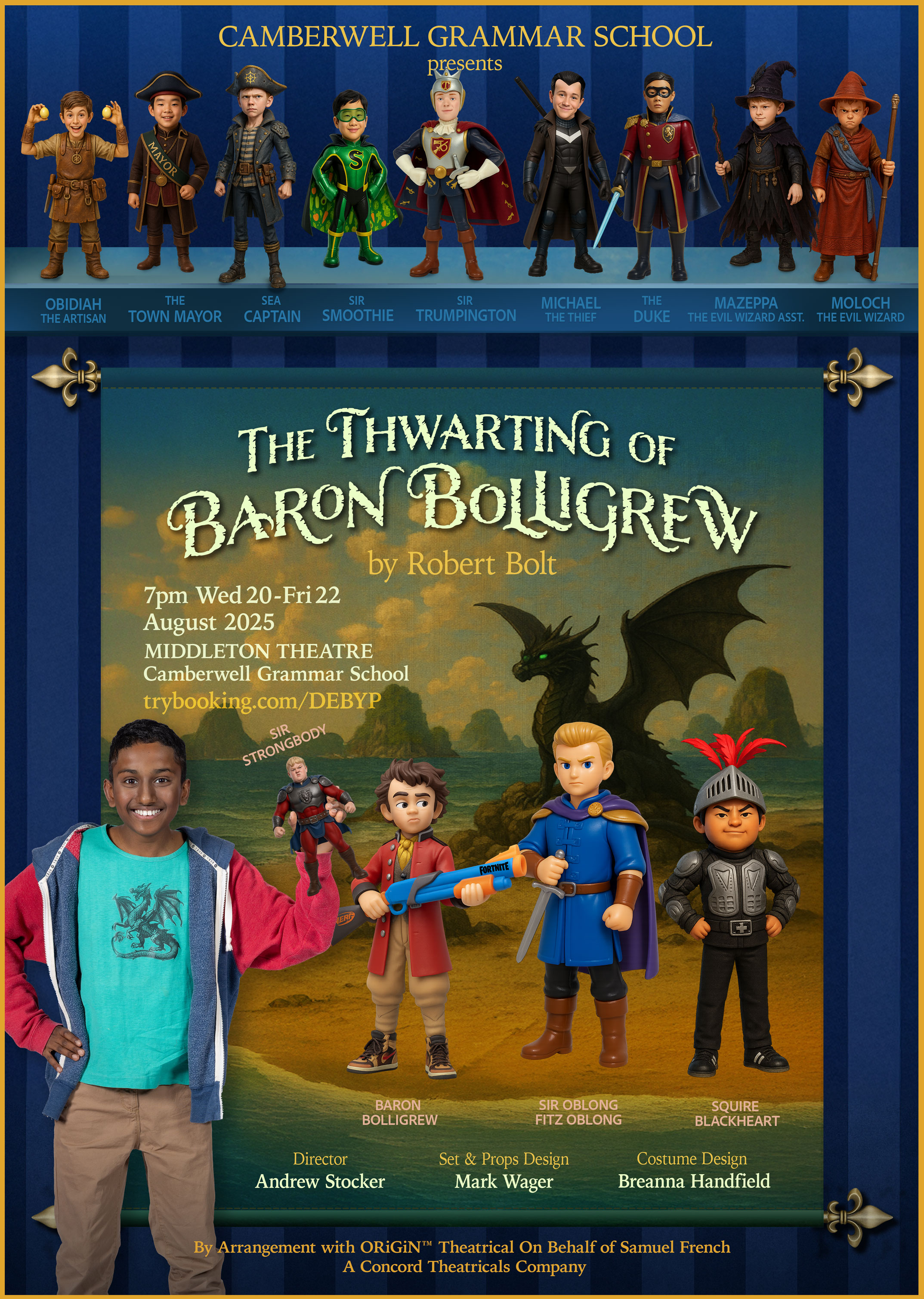 Step into a world of dragons, magic, and delightful trickery! This year's Middle School Production 'The Thwarting of Baron Bolligrew' is a fast-paced, hilarious tale of courage, cunning, and the clash between good and evil. Join the noble but naive Sir Oblong Fitz-Oblong as he takes on the dastardly Baron in this witty and whimsical medieval adventure. Recommended for ages 6 and up.