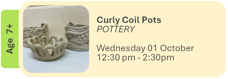 Get creative with clay in this hands-on workshop just for kids 7 and up! Learn awesome hand-building techniques to shape your very own Curly Coil Pots!