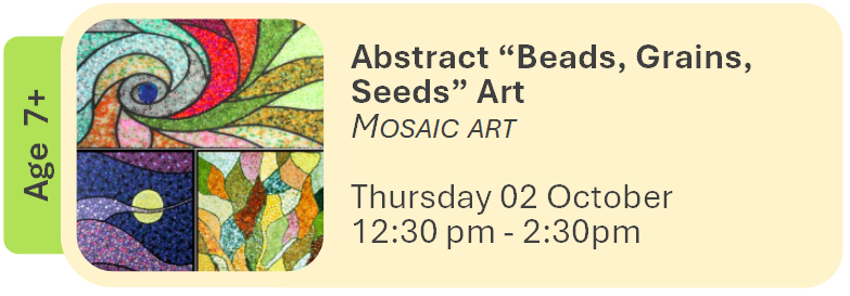 Get creative in this hands-on workshop -- Join our tutor Claire, and let kids to create their own Abstract Mosaic Art using colourful Beads, Grains, and Seeds!