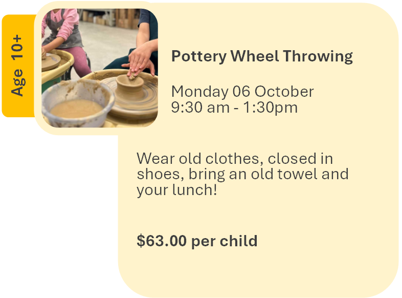 Get your hands muddy and spin up some fun! Join us to create your very own pottery using the awesome wheel-throwing technique – it's messy, creative, and a blast!