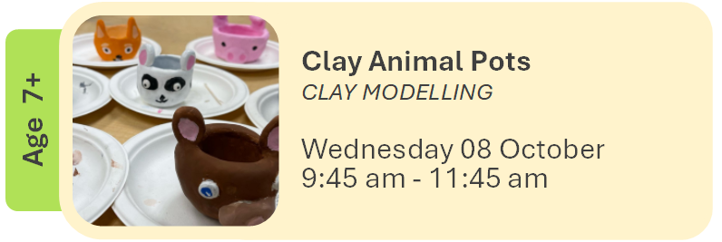 Join our tutor Ramsha, and create Clay Animal Pots using air-dry clay, kids will hand-build small pots shaped like cute animals, then paint and seal them.