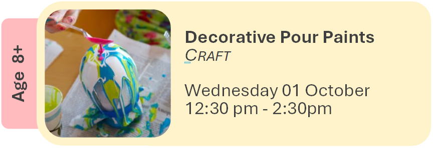 Join our tutor Cymon and learn the acrylic paint pouring method to decorate a piece of repurposed crockery, clay or glassware, giving an everyday item a unique glow up. Children will be shown how to make their own pouring mediums and taught pouring techniques to help them enhance their supplied base piece with creative painting.