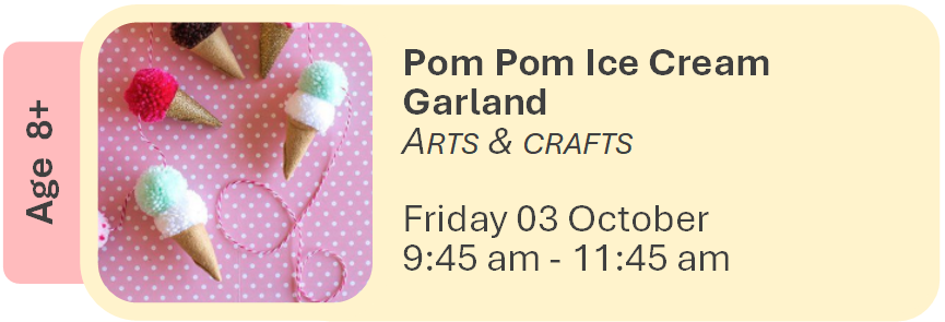 Get creative and have some fun! Join out tutor Cymon and create your very own Popm Pom Ice Cream Garland. Students will create a maximum of 3 ice cream pom-poms.