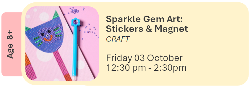 Get your hands creative and have some fun! Join us with our Tutor Cymon for Sparkle Gem Art – Sticker & Magnet Workshop allows kids to apply faux gems to a pre-glued background, creating a mosaic-like image with shiny stones on a sticker or magnet.