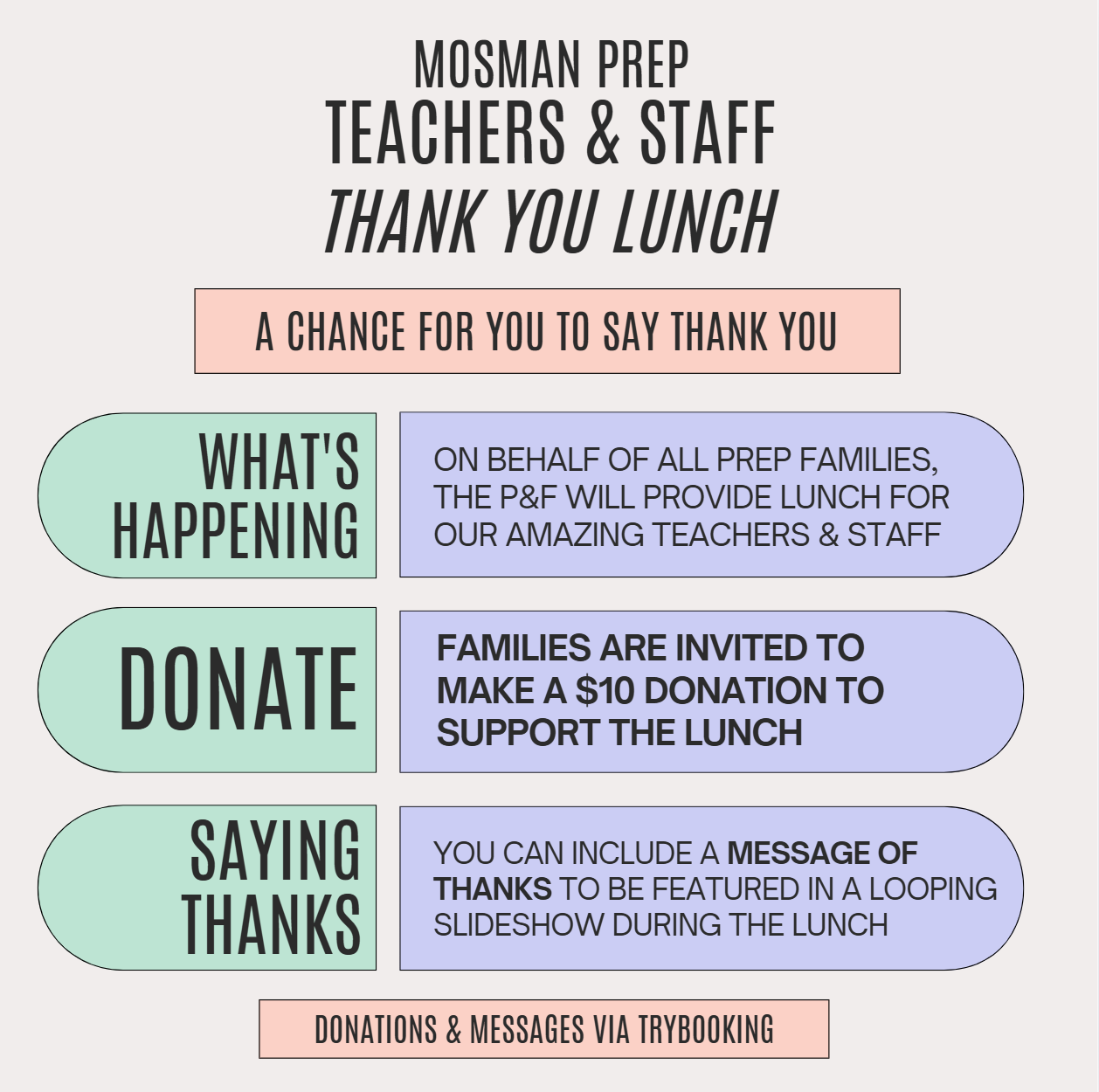 This year families will be providing a Thank You Lunch on Wednesday 29 October - facilitated by your P&F.