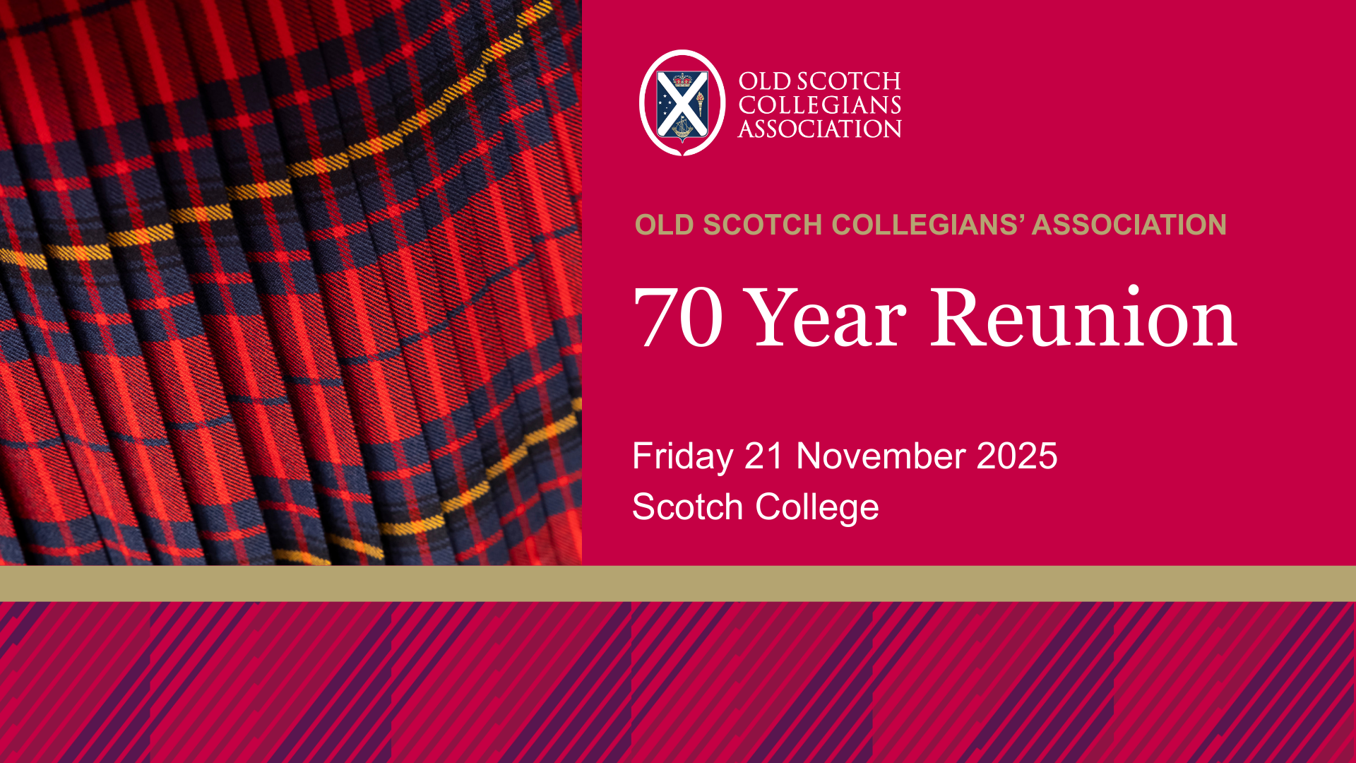 Date: Friday 21 November 2025 Time: 11.30am for 12pm Venue: Boykett Room, Cardinal Pavilion | Scotch College Inclusions: Lunch and drinks Cost: $85 per person Dress: Neat casual Please note this is a past student only event RSVP: Bookings and payment can be made online by Friday 14 November 2025 Spread the word: Our database is very helpful but there are always a significant number of ‘lost’ Old Collegians for whom we do not have contact details. Please encourage others to come along. We look forward to welcoming you back to Scotch College to celebrate your 70 year reunion.