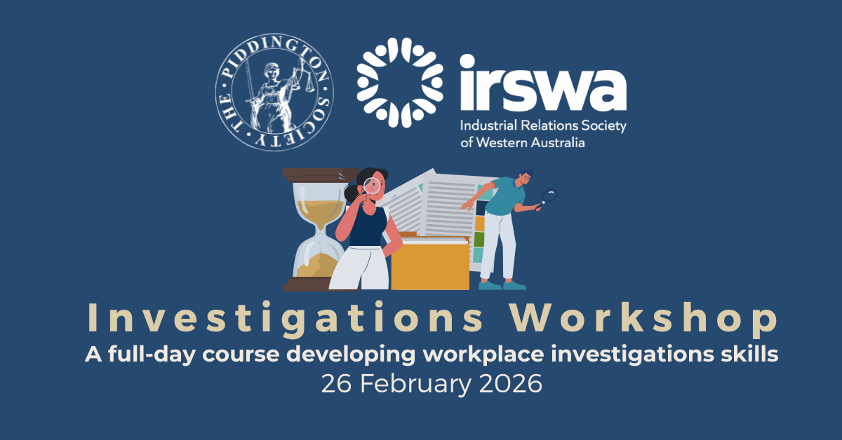 A collaboration between the Industrial Relations Society of WA and The Piddington Society, the Investigations Workshop takes you through the key issues of workplace investigations from before they start through to making findings.