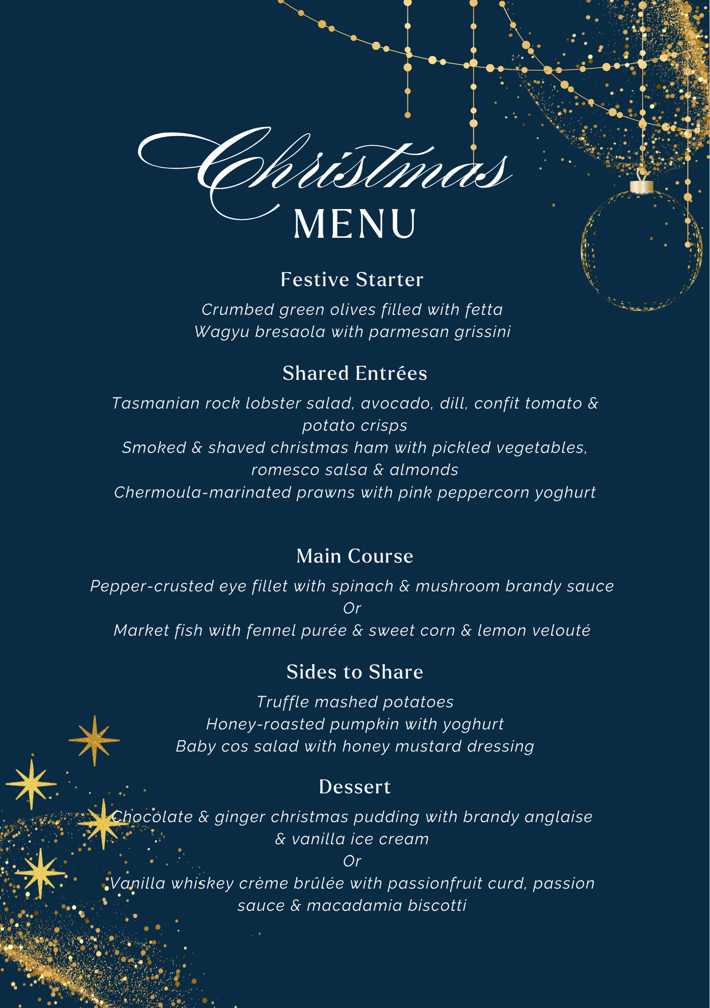Your dinner will be accompanied by 2.5 hours of house beverages, so you can sip, toast, and soak in the joyful spirit of the season. With everyone in the right place at the right time, we can sprinkle the holiday magic, share laughter, and make this Christmas Day truly sparkle for all.