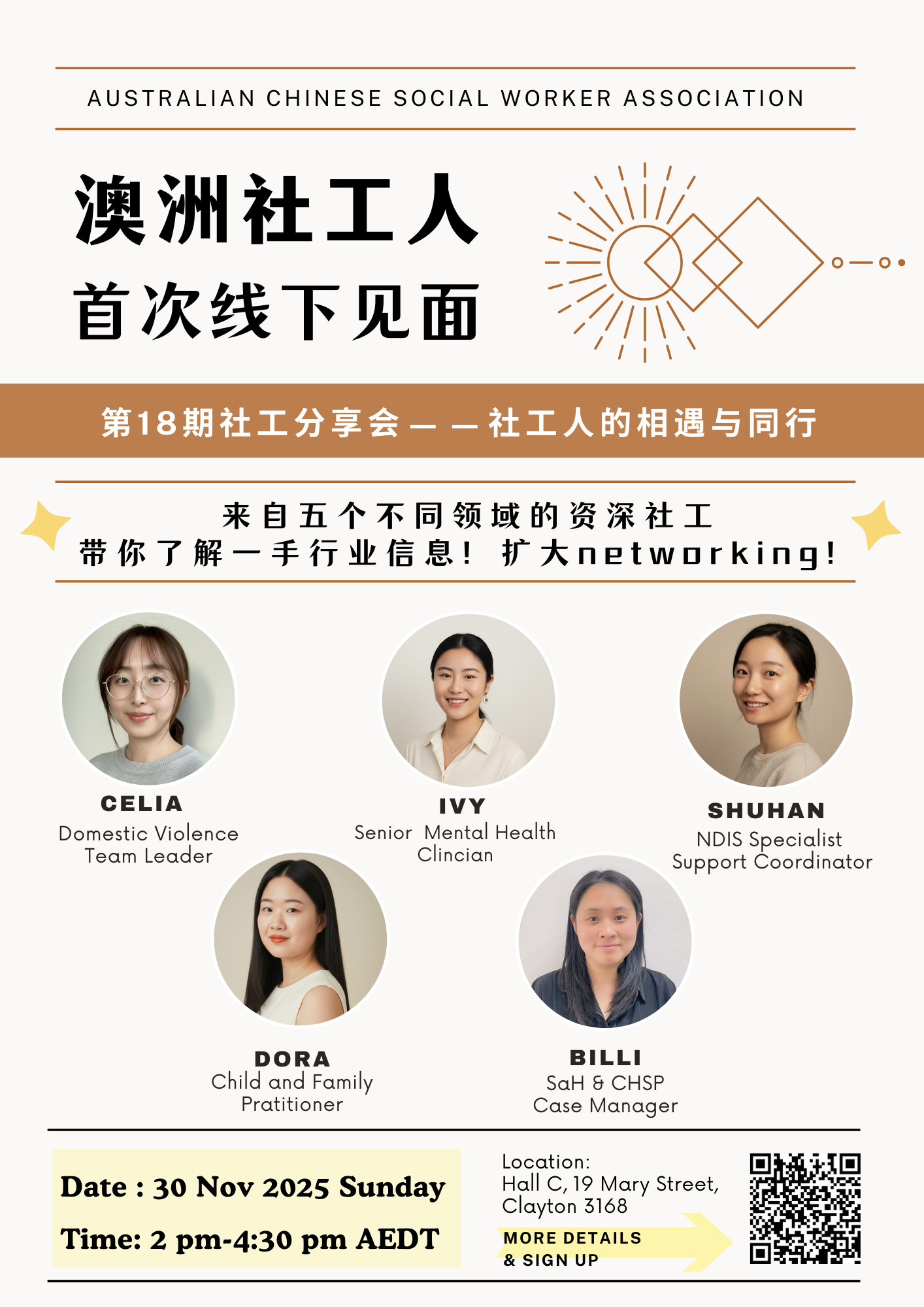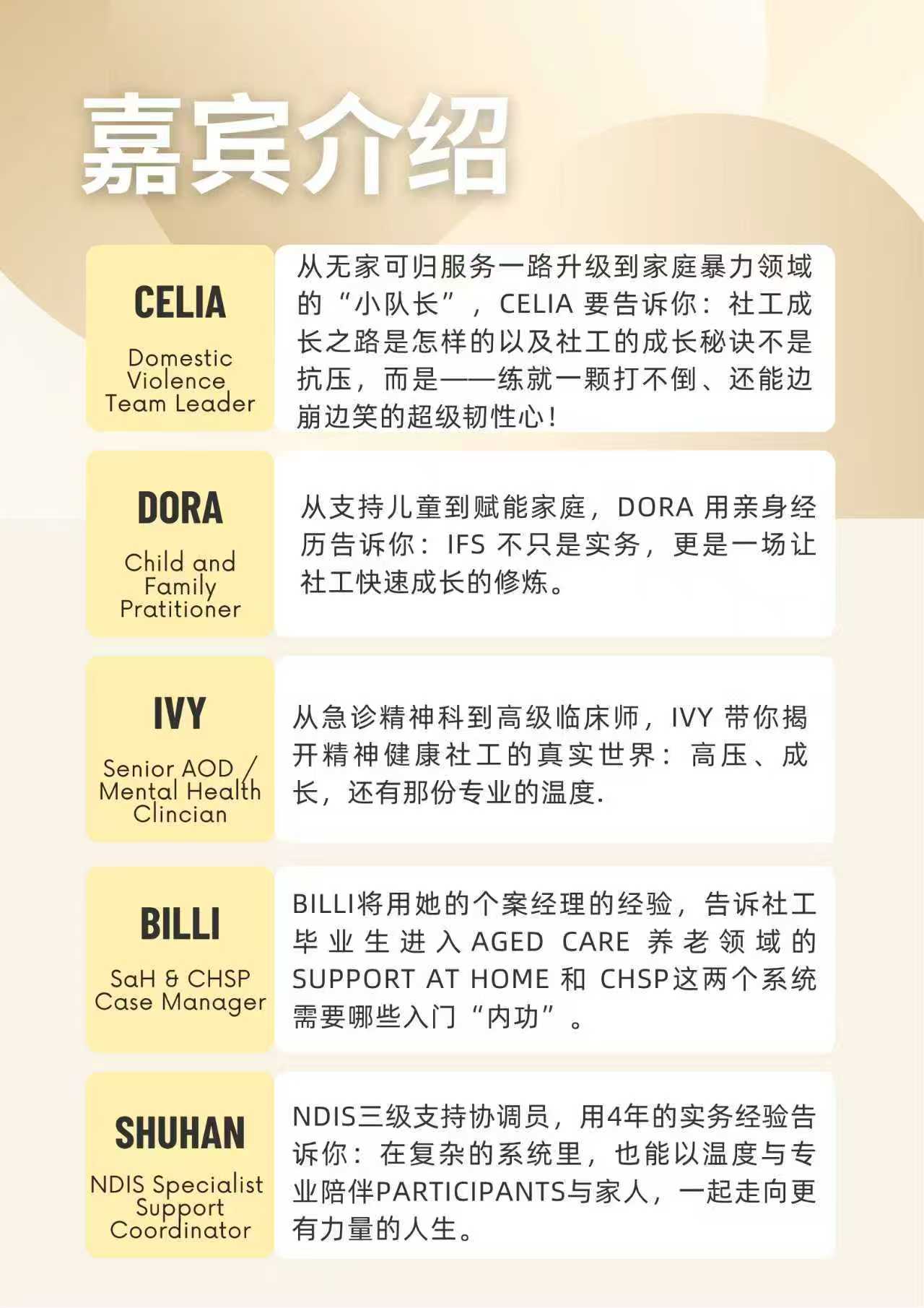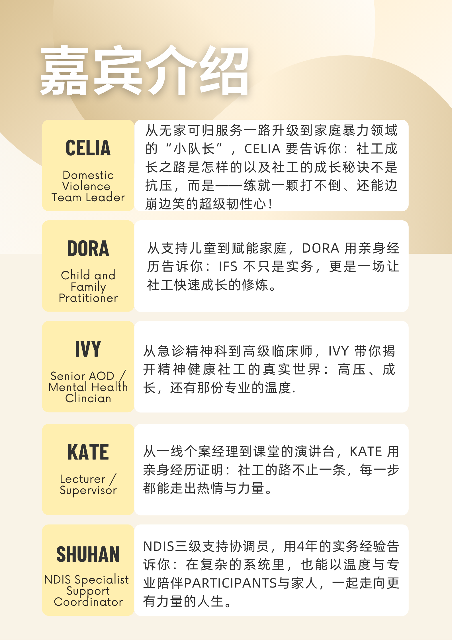 👥 此次分享会我们邀请了来自5个不同领域的资深社工,带来丰富的一线经验与职业见解,帮助你了解澳洲社工行业的多样路径与发展机会。