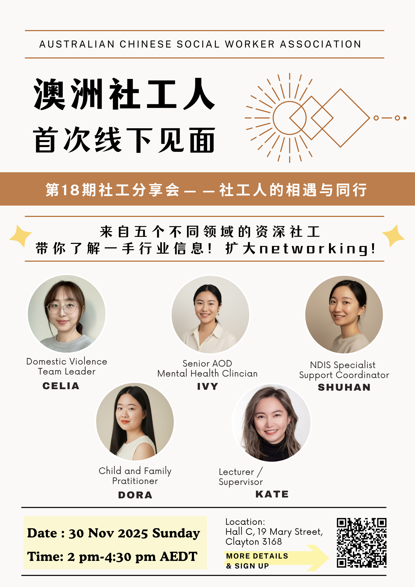 🇦🇺 澳洲社工人(Australian Chinese Social Worker Association)第18期分享会澳洲社工人将在2025年11月30日下午2点 - 下午4点30分举办第18期分享会,也是首次线下特别活动。