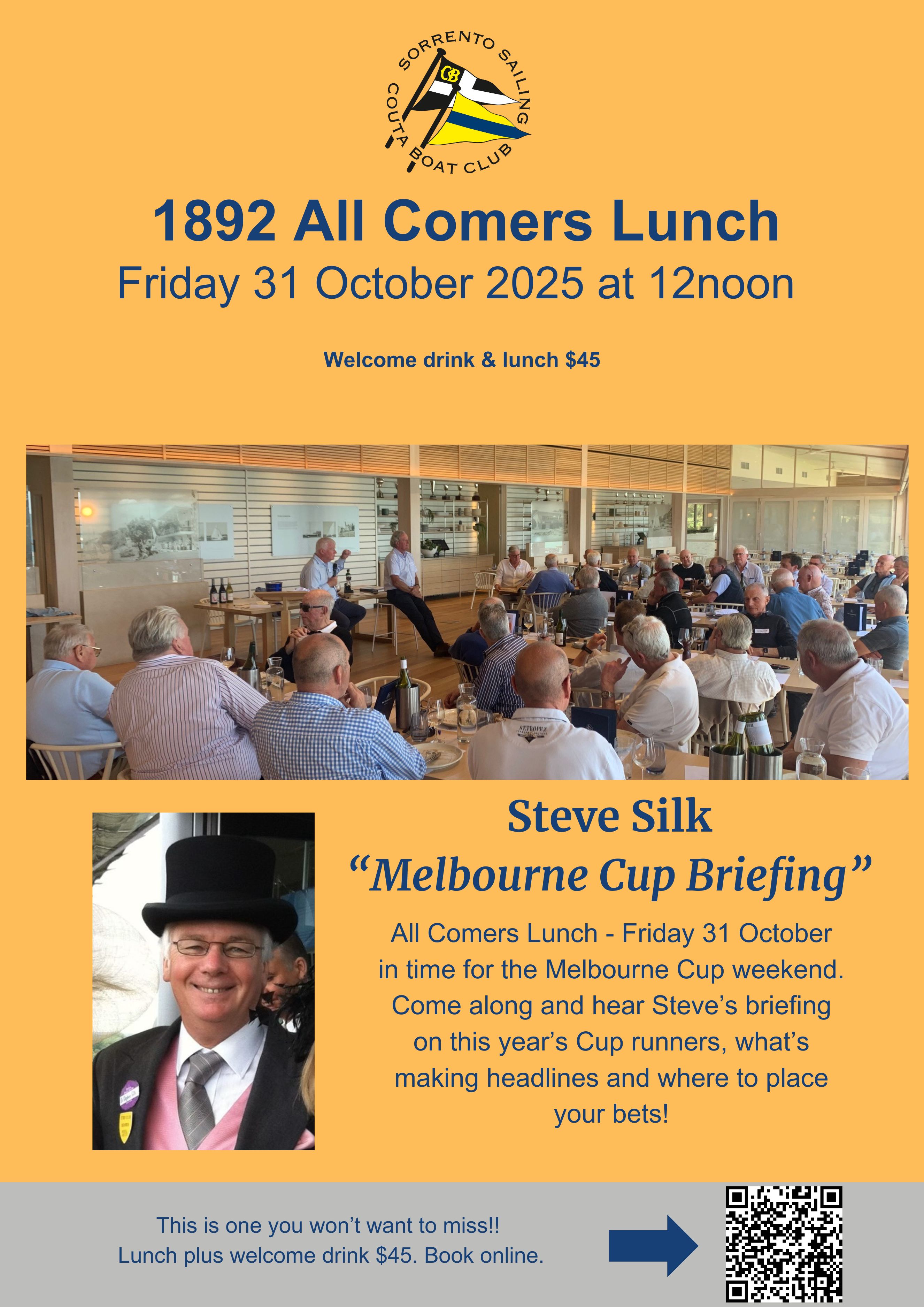 Join us for lunch and to hear from Steve Silk in preparation for this year's Melbourne Cup. Hosted by Chris Malkin, Ralph Wilson & Merv Baird. Enjoy great company, good food and a bit of fun conversation!