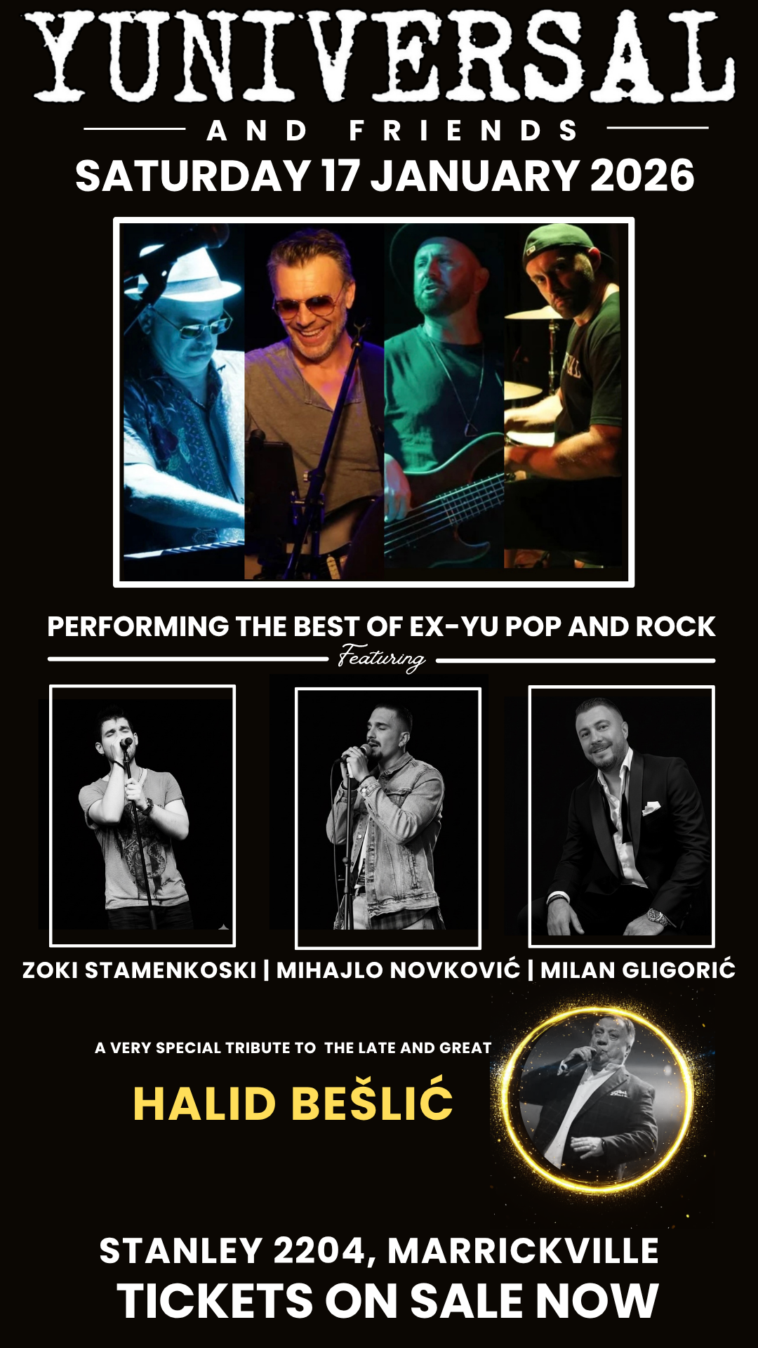 Join us for an unforgettable evening of live performances by Yuniversal, a Sydney-based band featuring some of the best vocal talent the Sydney Ex-YU scene has to offer, including Zoki Stamenkoski, Mihajlo Novković and, for the first time, Milan Gligorić.