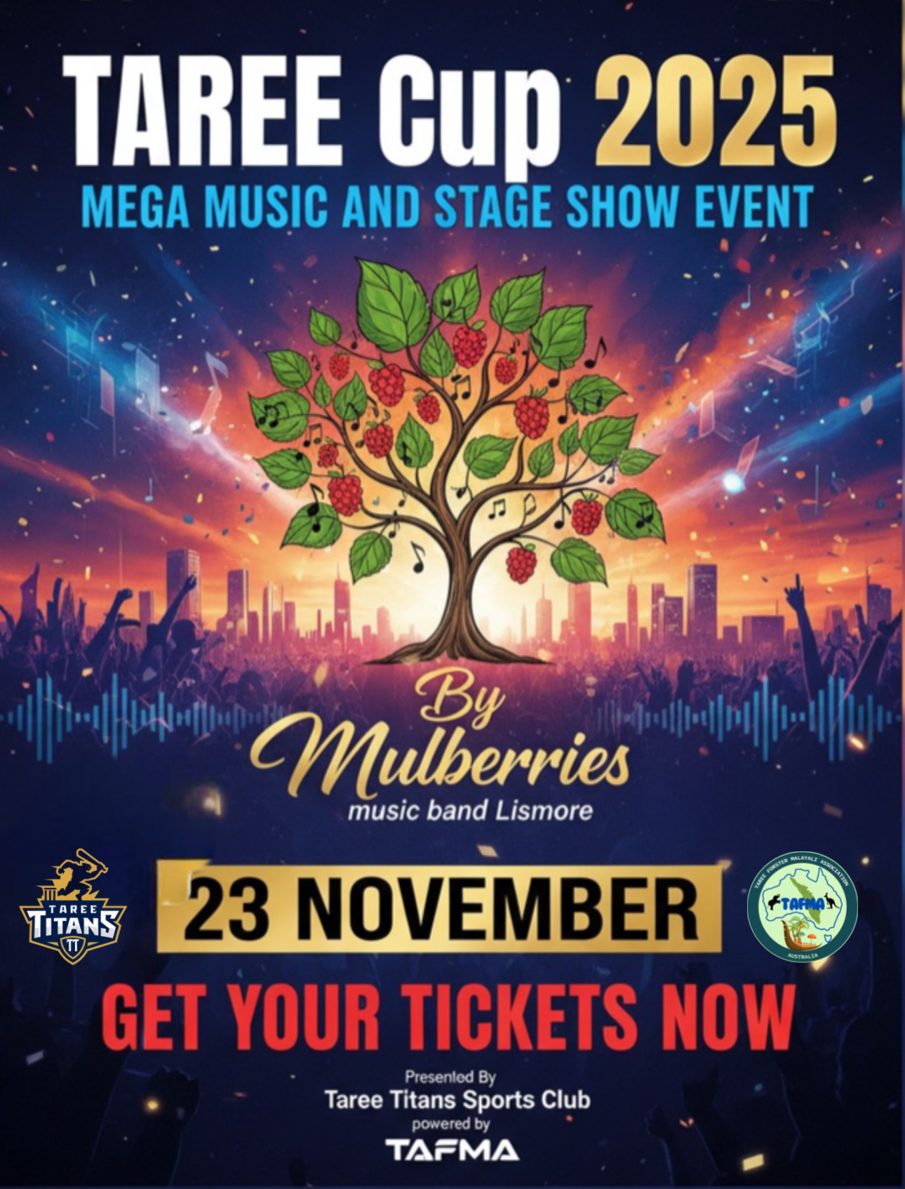 Get ready for an unforgettable evening as Mulberries Music Band from Lismore takes the stage right after the thrilling TAREE Cup 2025 Cricket Tournament!