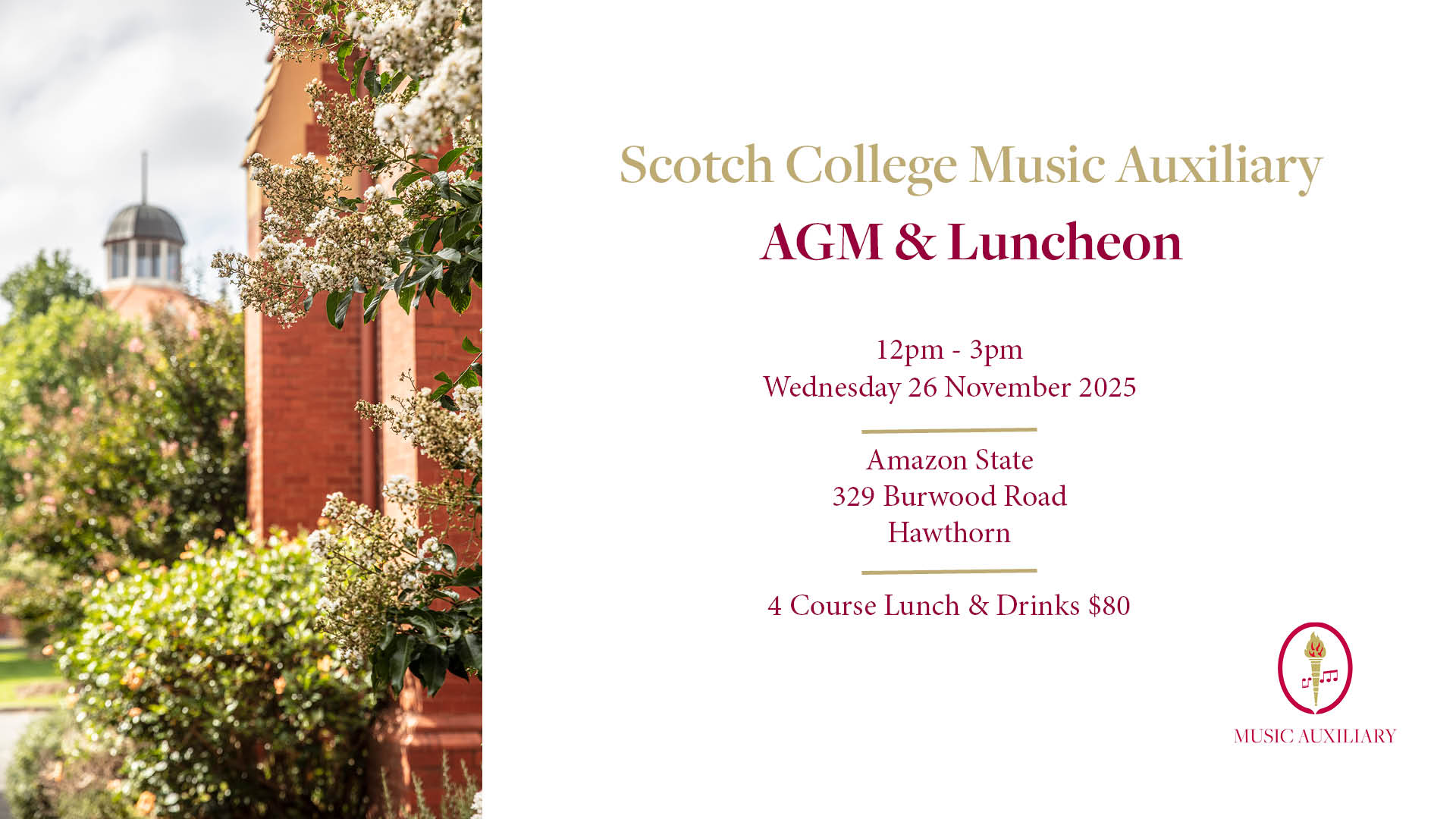 All members of the Scotch College Music Auxiliary are invited to attend SCMA's Annual General Meeting, followed by a celebratory lunch.