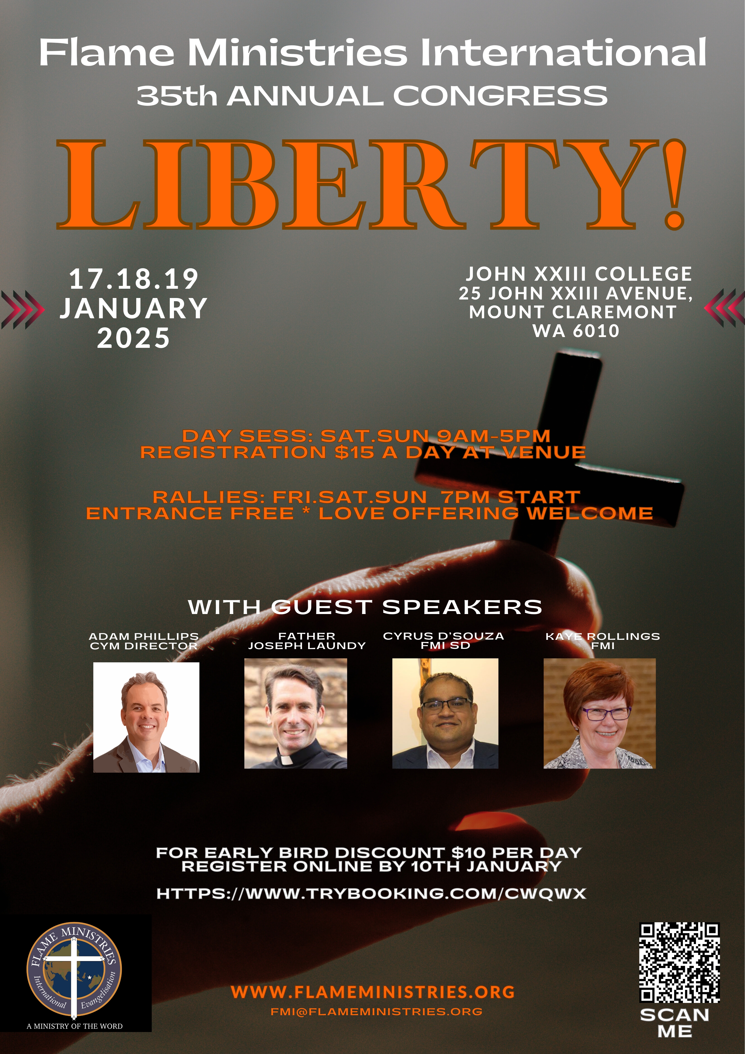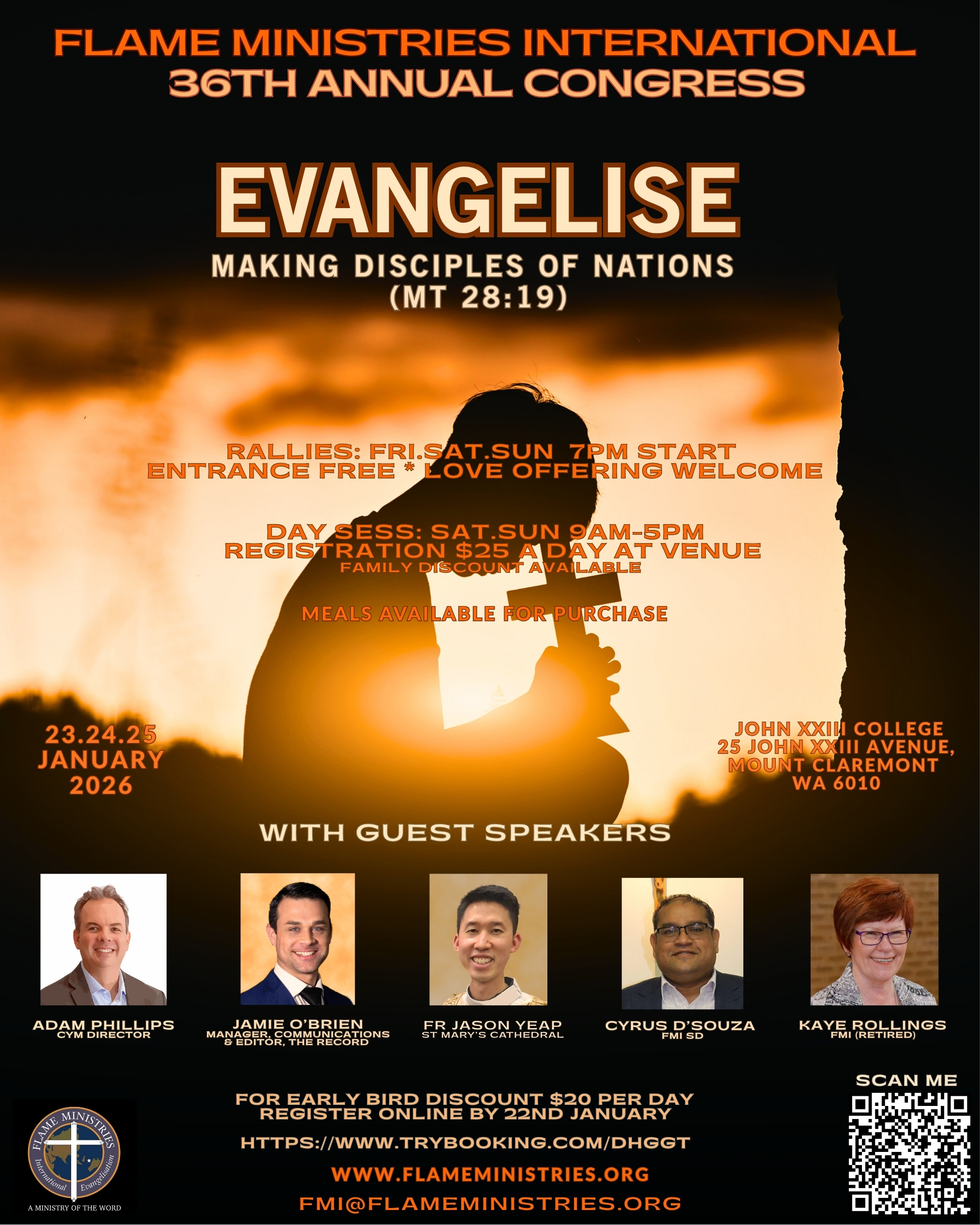 Flame Ministries International is holding their 36TH Annual FLAME Congress from January 23rd to 25th, 2026. The theme is 'evangelise' and the aim is to bring participants into a deeper and more intimate relationship with God.