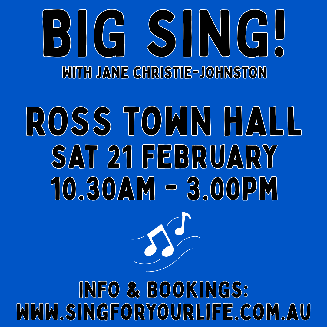 Come and spend the day singing up a storm with Sing For Your Life! Choir Director Jane Christie-Johnston! We're headed to the gorgeous town of Ross, Tasmania, for a one-day Big-Sing event. We'll sing mostly gospel and folk songs - all in 3-part and 4-part harmony - and this event will be relaxed and welcoming. No sheet music and no stress - just a really fun session with gorgeous harmonies.