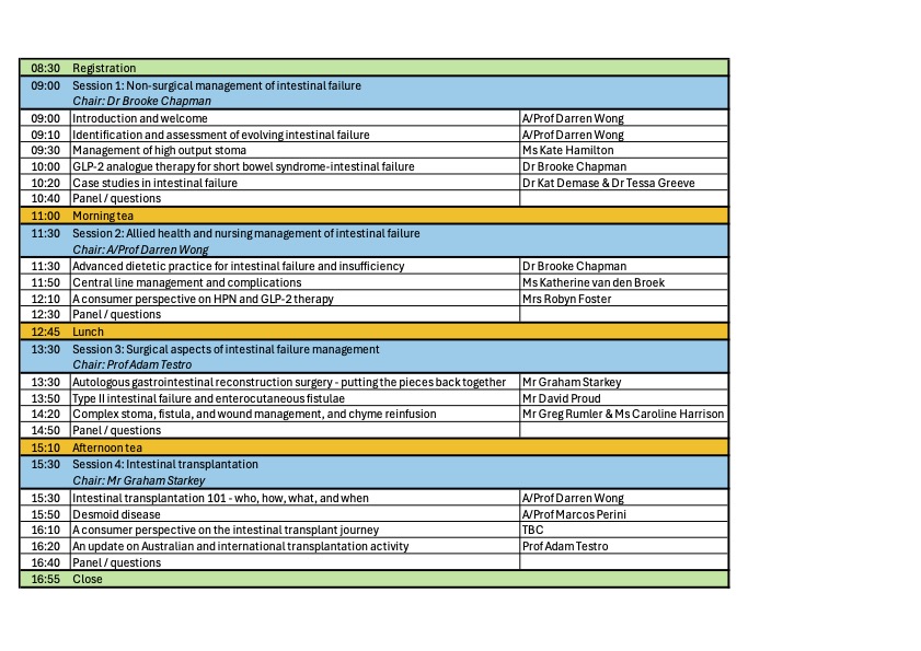 Austin Health's inaugural intestinal failure and transplantation symposium aims to provide clinicians with contemporary approaches to managing patients with intestinal failure and highlight the complex multidisciplinary care involved.We invite gastroenterologists, surgeons, trainees, dietitians, pharmacists and nursing staff who are involved in the care of patients with intestinal failure to attend.