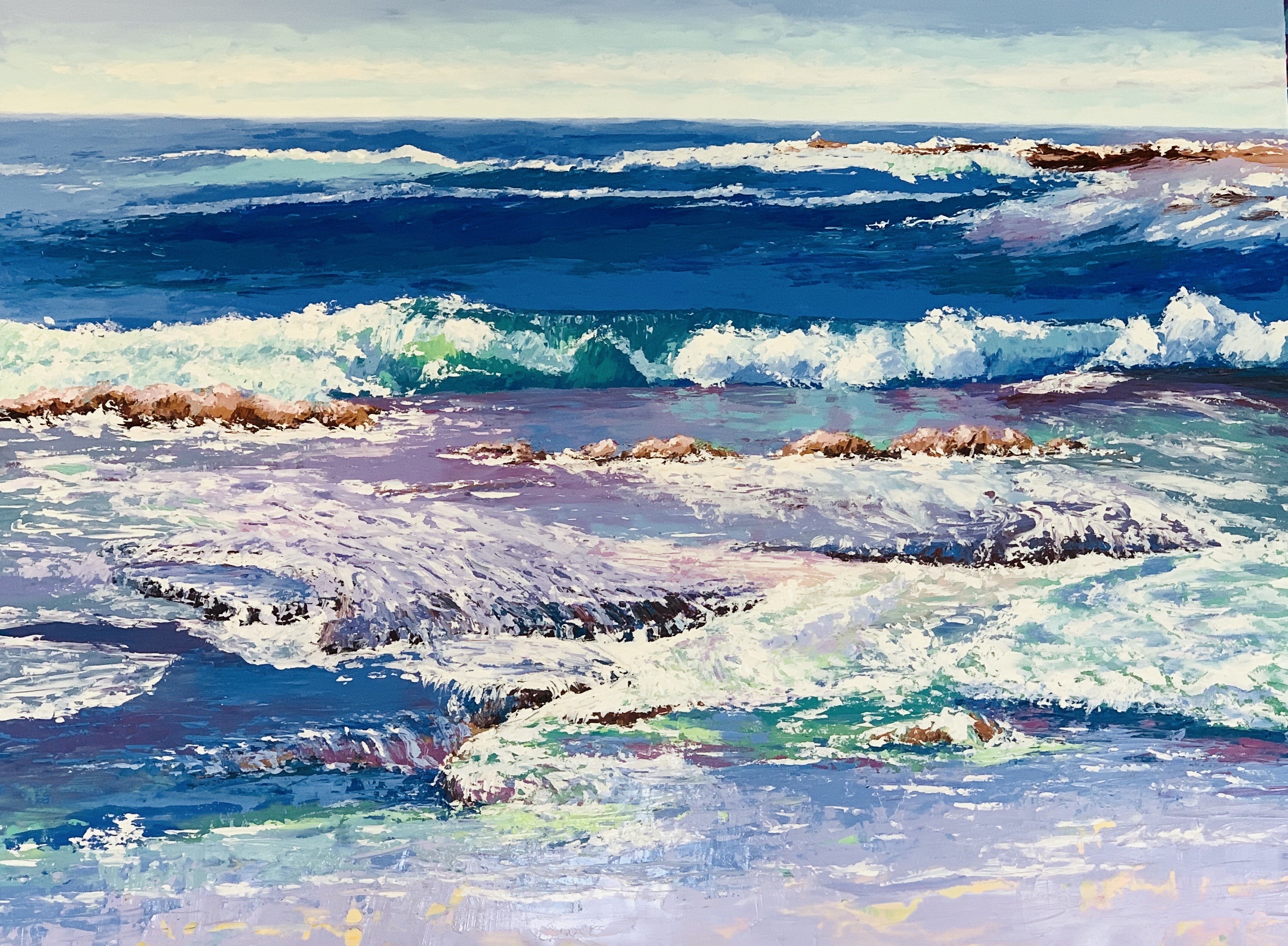 This workshop gives comprehensive information on understanding all the facets of acrylics. The application for the paintings of seascapes and skies will be done in lovely loose expressive marks of the impressionistic style. Both brush and pallet knife will be used to produce these paintings.