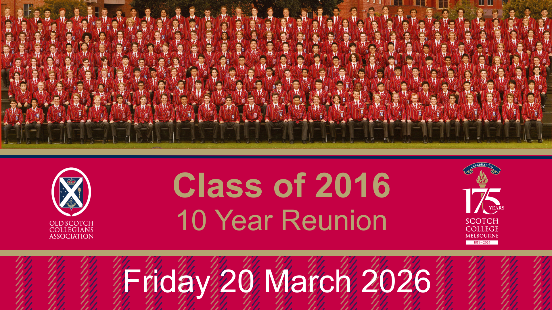 Inclusions: Food and beverages will be served. Cost: $60 per person Dress: Casual Please note, this reunion is for past students only RSVP: Bookings and payment can be made online by Friday 13 March 2026 Spread the word: Our database is very helpful but there are always a significant number of ‘lost’ Old Collegians for whom we do not have contact details. Please encourage others to come along. We look forward to welcoming you back to Scotch College for this very special occasion.