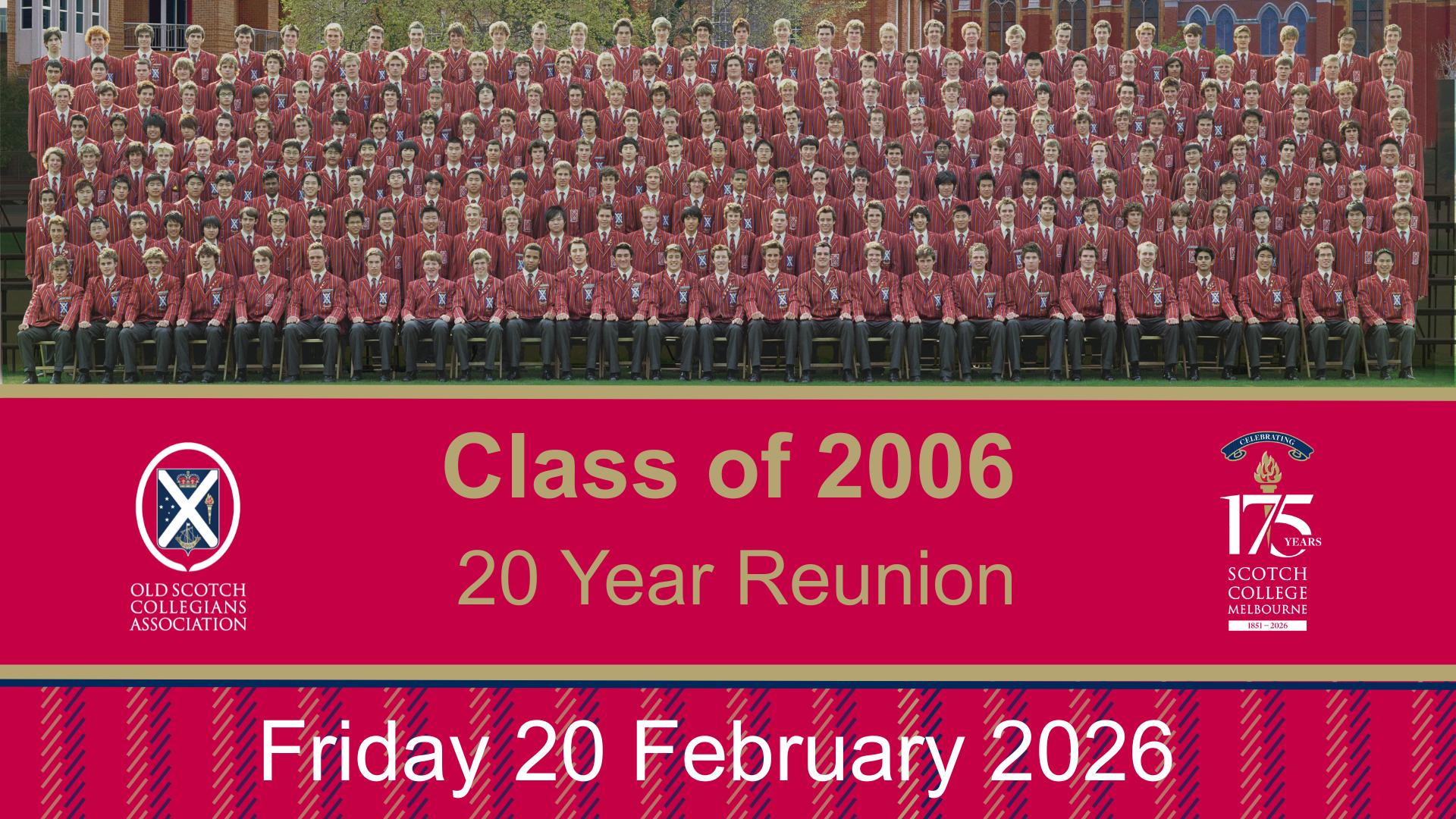 Date: Friday 20 February 2026 Time: 6pm - 9.30pm Venue: Keon-Cohen Dining Hall Scotch College Inclusions: Food and beverages will be served. Cost: $65 per person Dress: Casual Please note, this reunion is for past students only RSVP: Bookings and payment can be made online by Friday 13 February 2026 Spread the word: Our database is very helpful but there are always a significant number of ‘lost’ Old Collegians for whom we do not have contact details. Please encourage others to come along. We look forward to welcoming you back to Scotch College for this very special occasion.