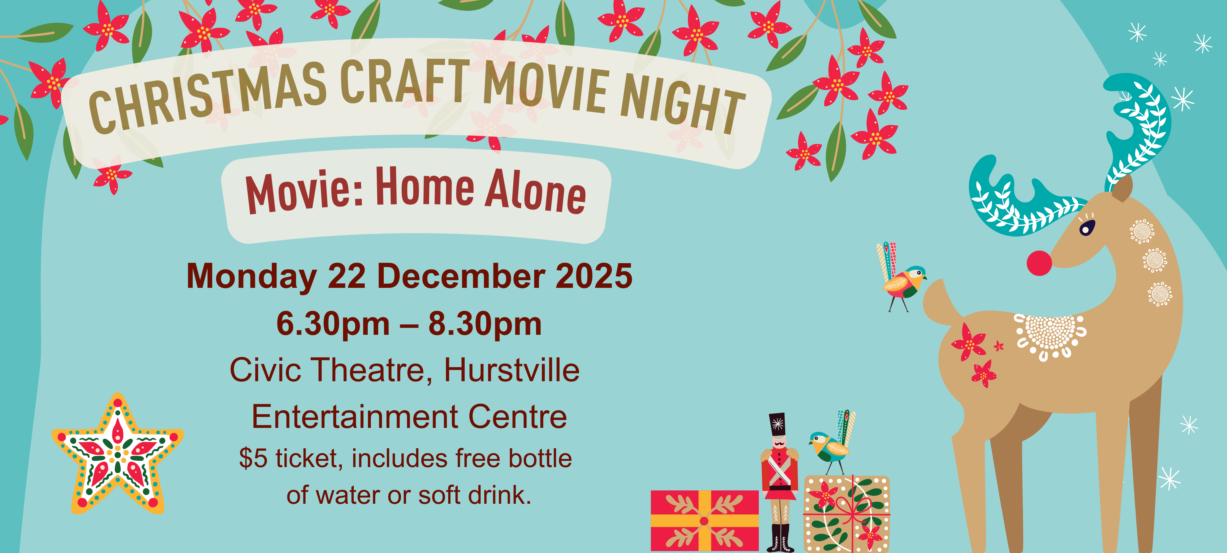 Bring your current crafting project and some Christmas cheer to our Craft Movie Night! Whether you're crocheting or drawing, enjoy the movie without worrying about the lights or disturbing your neighbour.
