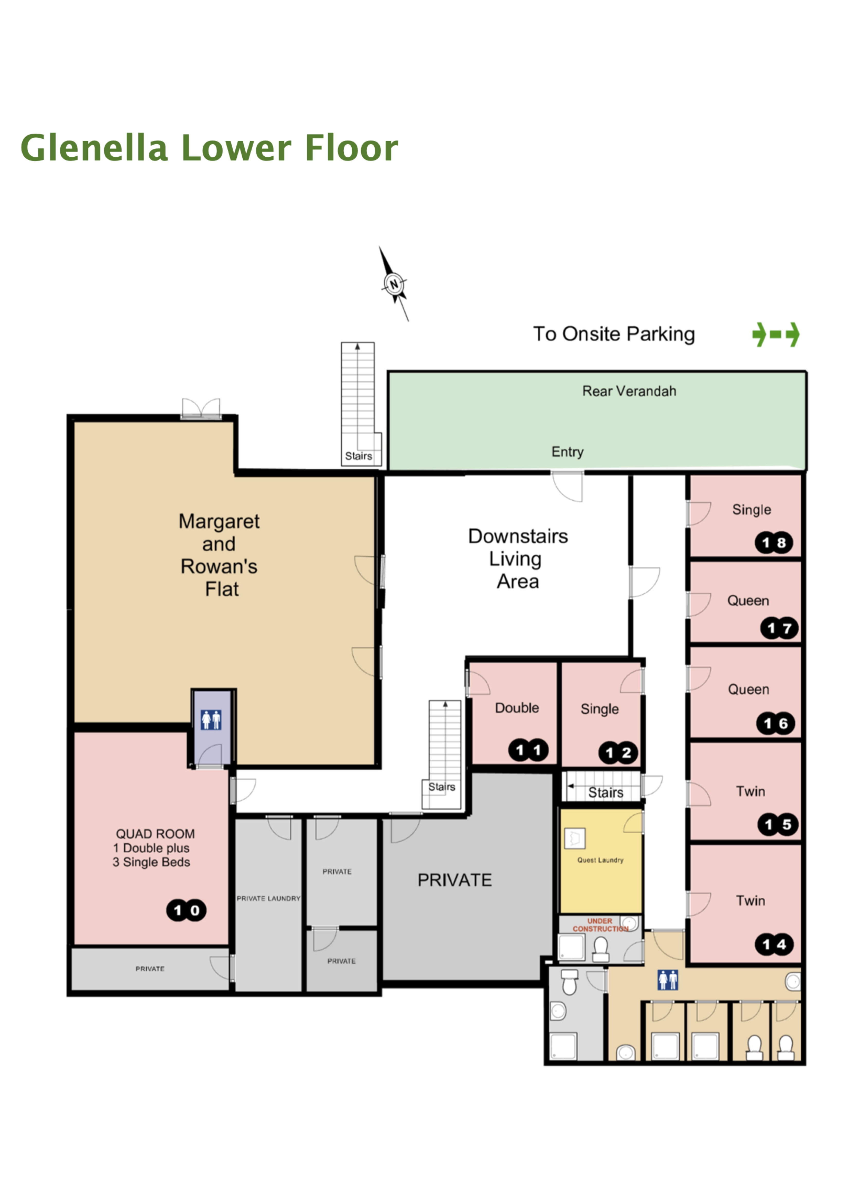 Glenella offers 15 bedrooms which range from heritage style rooms with ensuites to traditional guesthouse rooms with shared bathroom faciliites. These rooms are spread over 2 levels. Regardless of which room you book, you have full access to all Glenella's facilities which include a giant self-catering kitchen, 3 living spaces, a dining area for 30, wood fireplace .... plus more.