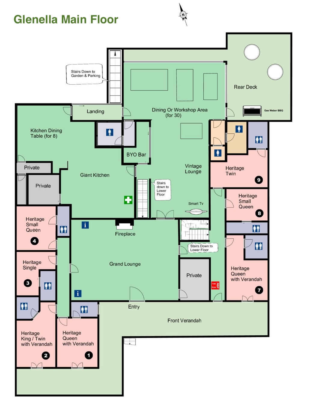 Glenella has 15 bedrooms - a mix of queens, singles, twins and one family room.  The 7 heritage bedrooms on the main floor all have ensuites.  On the lower floor the family room has an ensuite and the 7 traditional guesthouse bedrooms share bathroom facilities down the hall.  See floor plans below.
