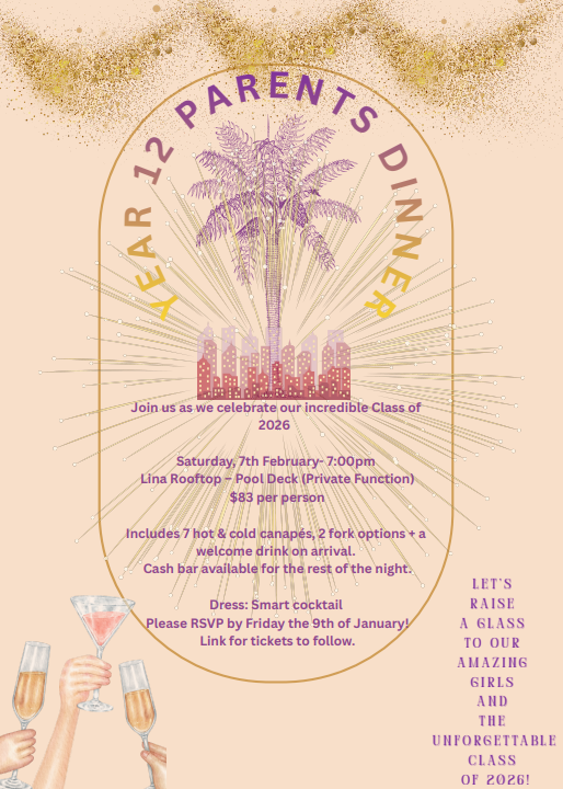The Year 12 Parent Reps warmly invite you to the Year 12 Parent Social night on the evening of the Senior Formal. Please come along and enjoy a catch up. Please see details below: