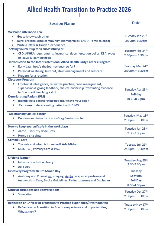 To support early career alllied health clinicians across in transition to practice. The program supports and encourages the continuous professional growth of allied health clinicians across all therapy and science work streams ti enhance skills and knowledge.
