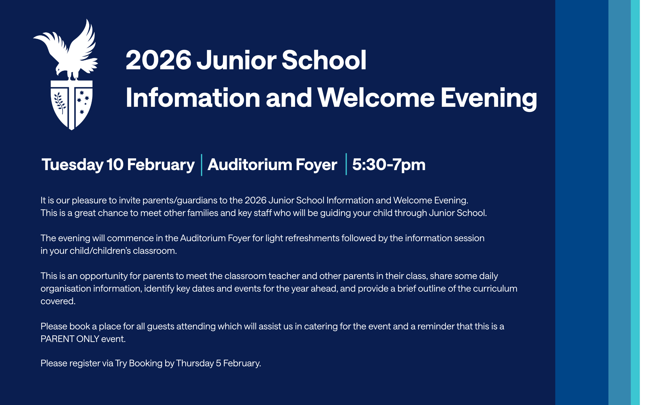 It is our pleasure to invite parents/guardians to the 2026 Junior School Information and Welcome Evening. A great chance to meet other families and key staff who will be guiding your child through Junior School.