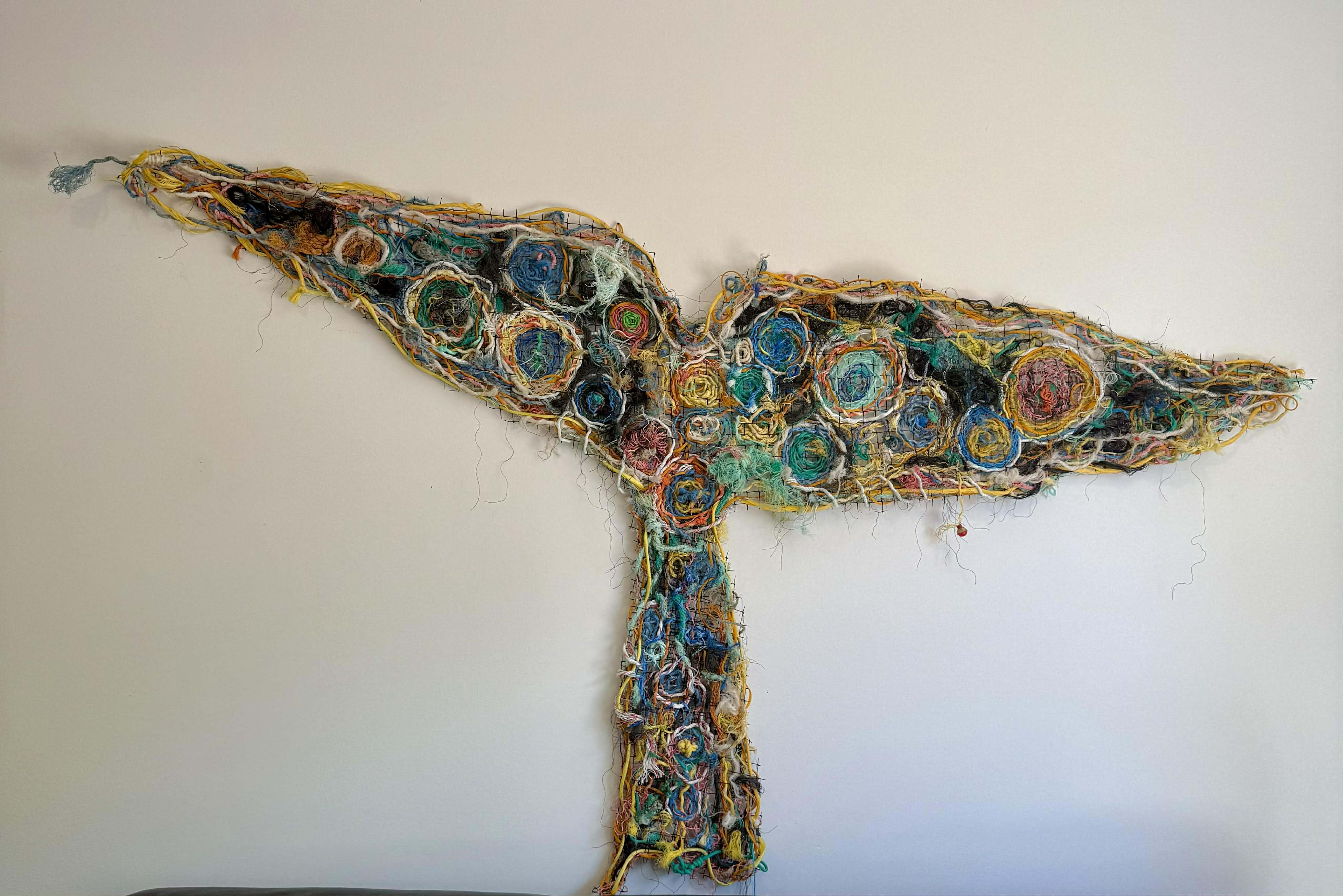LEONIE BROWN ‘Whale Tail’ is a work in progress and has slowly been created over ten years. The rope has been collected over that time from beaches around the Surfcoast, around Australia and around the world. The idea that each piece of rope picked up saves injury to an ocean or air creature. My love/hate relationship with plastic waste initially came from teaching ‘take 3 for the sea’ to Surfcoast students at Bellbrae.