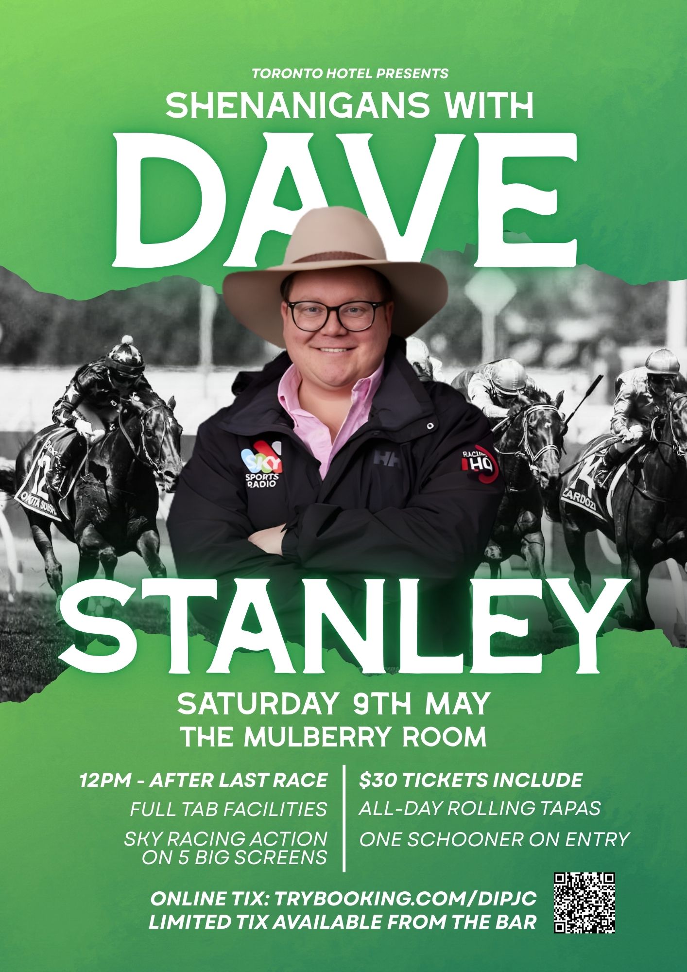 Toronto Hotel is proud to present an exclusive race day experience with Sky Racing personality Dave Stanley, bringing his sharp insights, racing banter and trademark humour to The Mulberry Room for a massive day of racing action.