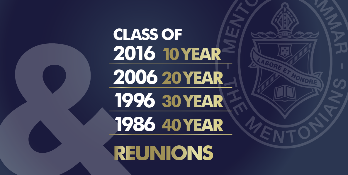 The Mentonians Association is delighted to invite you to celebrate your milestone reunion on Thursday 19 March at Mentone Grammar’s Bayview Building – Gumtree Courtyard.