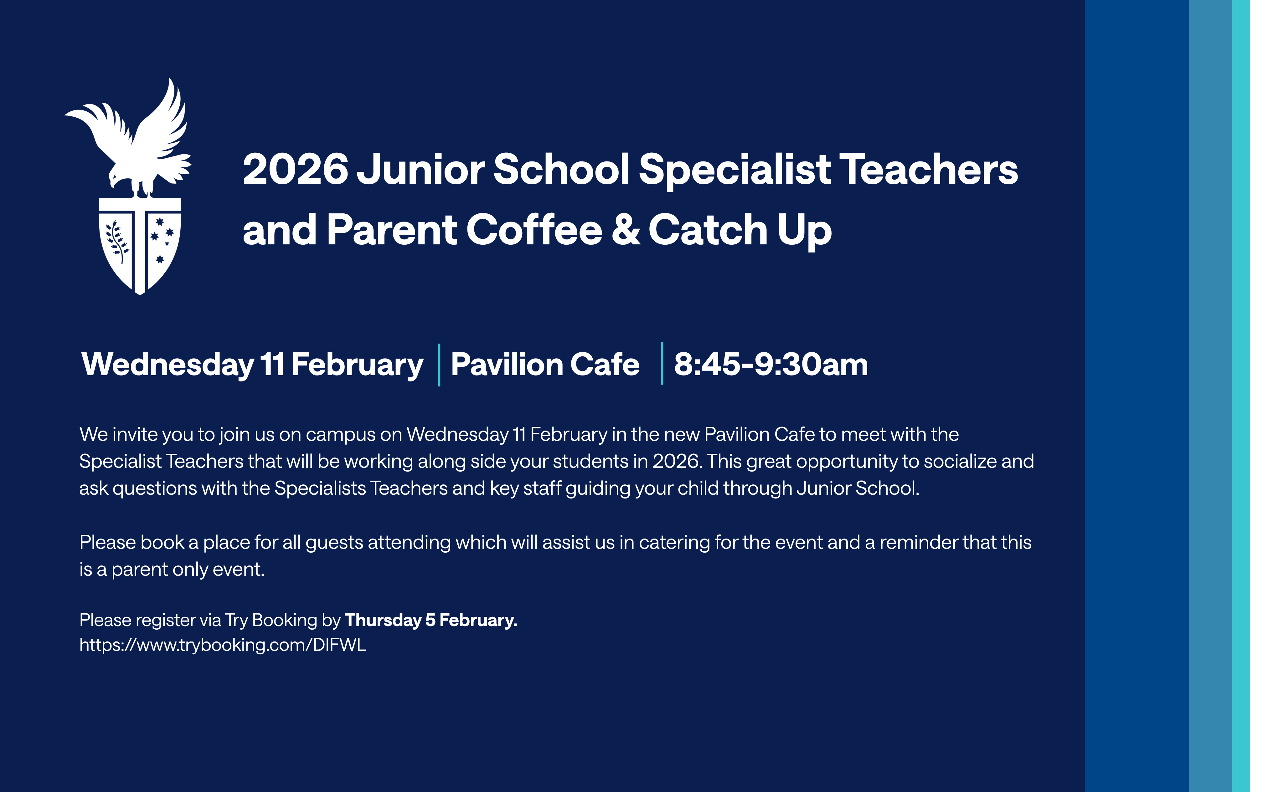 We invite you to join us on campus on Wednesday 11 February in the new Pavillion Cafe to meet with the Specialist Teachers that will be working along side your students in 2026. This great opportunity to socialize and ask questions with the Specialists Teachers and key staff guiding your child through Junior School.