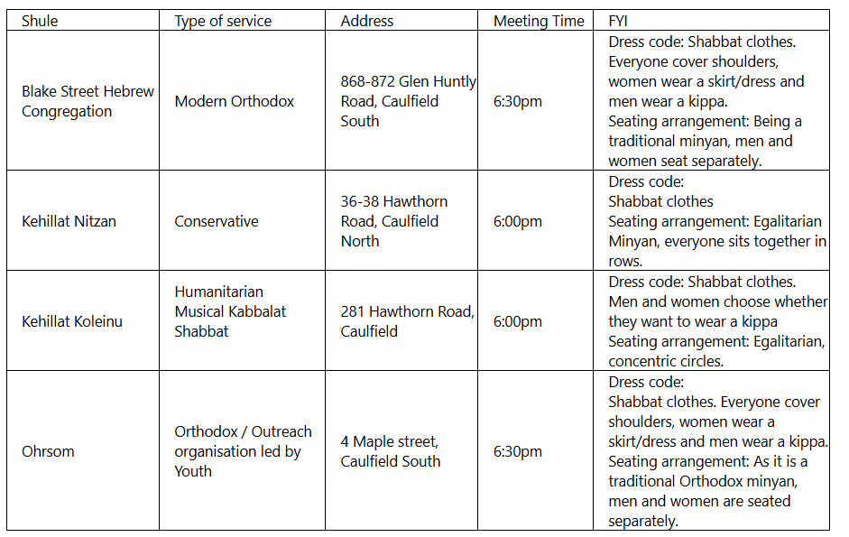 As a pluralist school we are offering students a choice to attend one of several Kabbalat Shabbat services, as outlined in the table below. Depending on the service each student chooses there are different details to note such as meeting times. Students must remember to be respectful to the community’s customs and it is an opportunity to either experience something new or something familiar on their Bialik Jewish education journey.