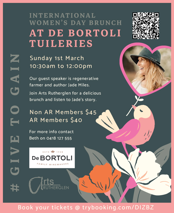 Join Arts Rutherglen this International Women’s Day for a delicious brunch at Tuileries Winery in Rutherglen.Our guest speaker, regenerative farmer and author Jade Miles, will share stories from her life, work, and inspiring journey.