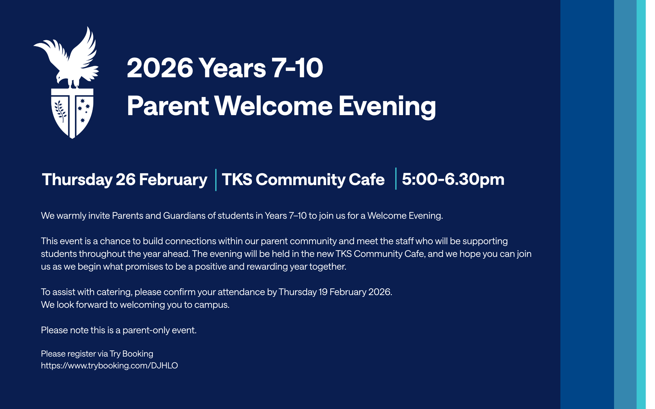 This event is a chance to build connections within our parent community and meet the staff who will be supporting students throughout the year ahead. The evening will be held in the new TKS Community Café, and we hope you can join us as we begin what promises to be a positive and rewarding year together.